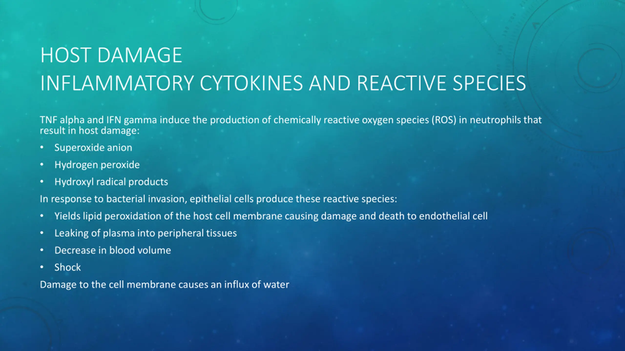 HOST DAMAGE INFLAMMATORY CYTOKINES AND REACTIVE SPECIES TNF alpha and IFN gamma induce the production of chemically reactive oxygen species (ROS) in neutrophils that result in host damage: Superoxide anion Hydrogen peroxide Hydroxyl radical products In response to bacterial invasion, epithelial cells produce these reactive species: Yields lipid peroxidation of the host cell membrane causing damage and death to endothelial cell Leaking of plasma into peripheral tissues Decrease in blood volume Shock Damage to the cell membrane causes an influx of water