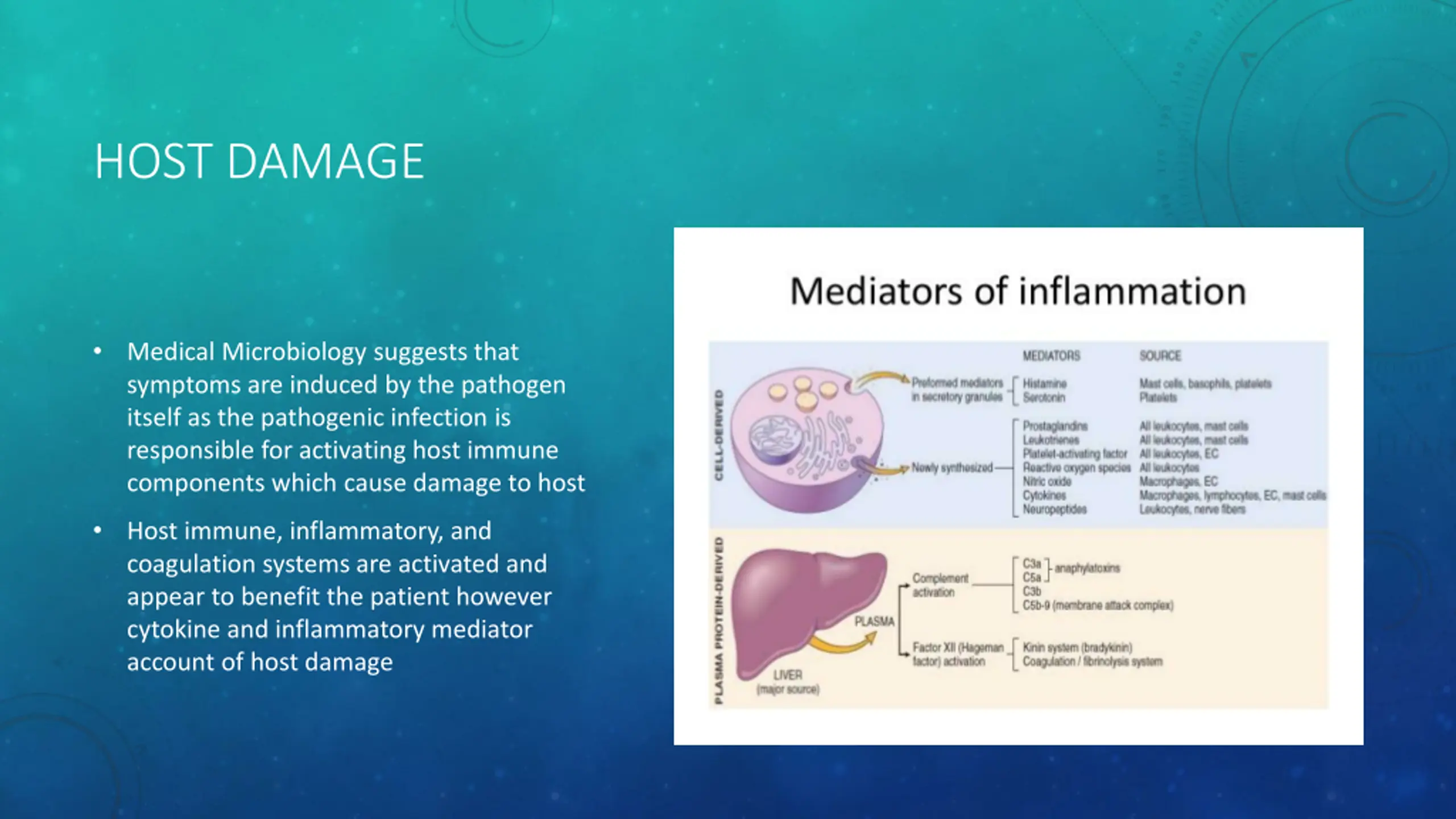 HOST DAMAGE Medical Microbiology suggests that symptoms are induced by the pathogen itself as the pathogenic infection is responsible for activating host immune components which cause damage to host Host immune, inflammatory, and coagulation systems are activated and appear to benefit the patient however cytokine and inflammatory mediator account of host damage