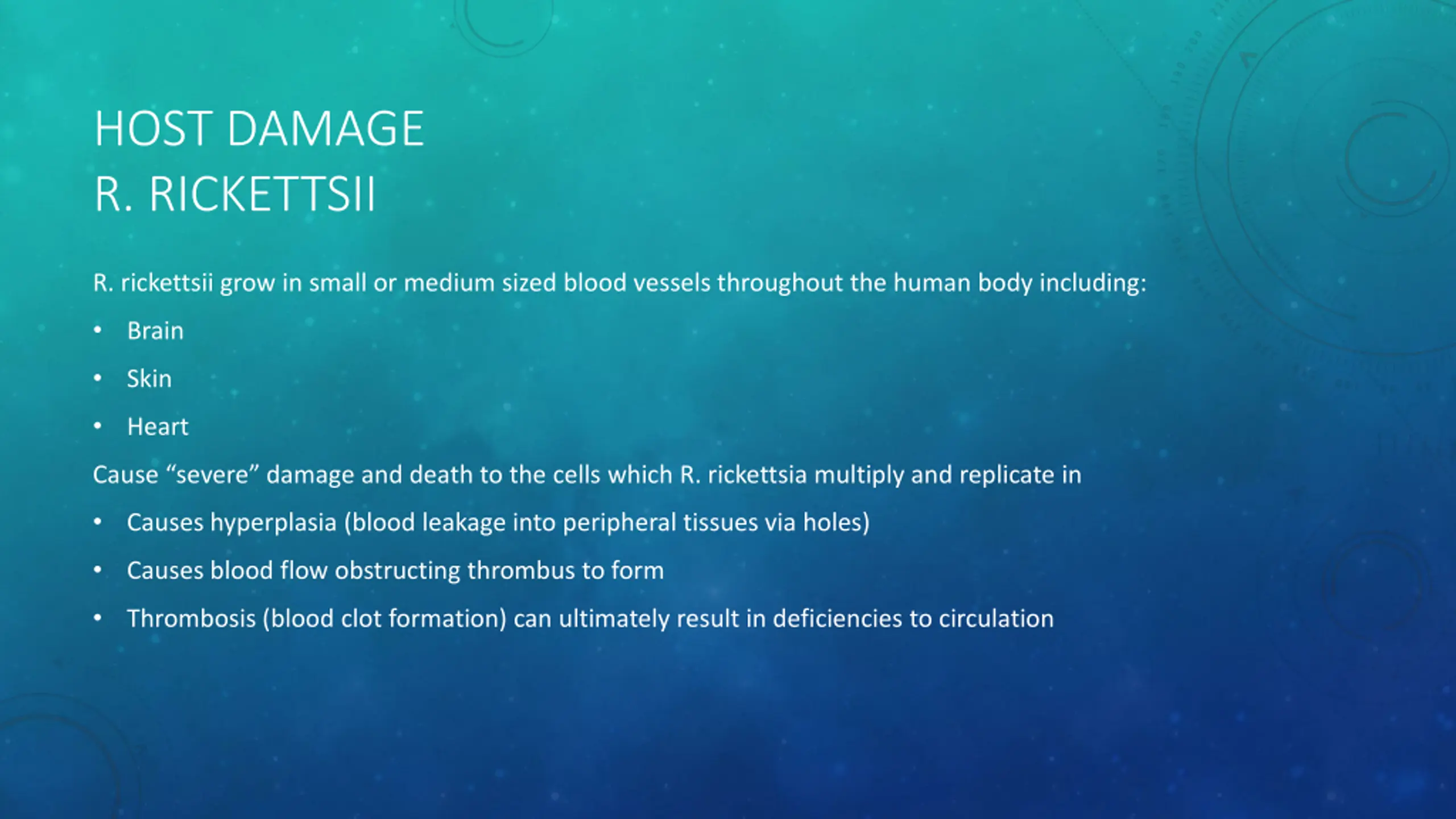 HOST DAMAGE R. RICKETTSII R. rickettsii grow in small or medium sized blood vessels throughout the human body including: Brain Skin Heart Cause severe damage and death to the cells which R. rickettsia multiply and replicate in Causes hyperplasia (blood leakage into peripheral tissues via holes) Causes blood flow obstructing thrombus to form Thrombosis (blood clot formation) can ultimately result in deficiencies to circulation