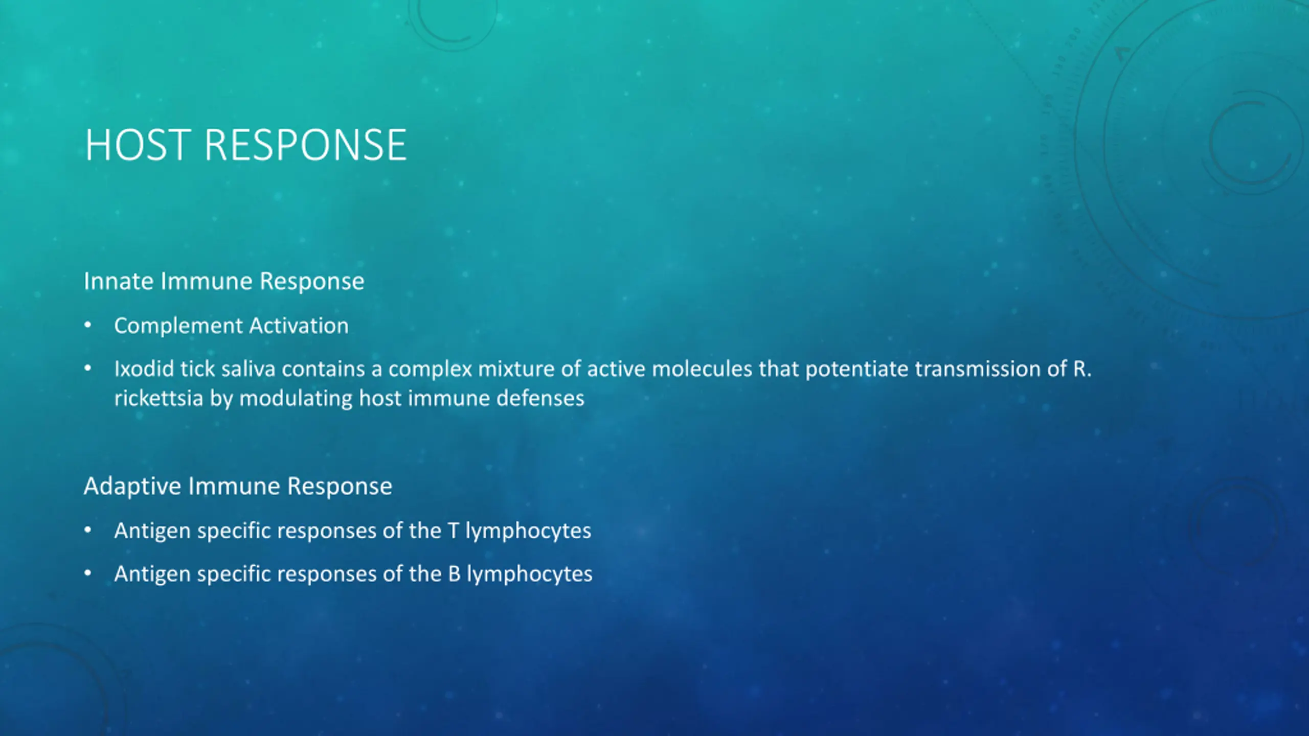 HOST RESPONSE Innate Immune Response Complement Activation Ixodid tick saliva contains a complex mixture of active molecules that potentiate transmission of R. rickettsia by modulating host immune defenses Adaptive Immune Response Antigen specific responses of the T lymphocytes Antigen specific responses of the B lymphocytes