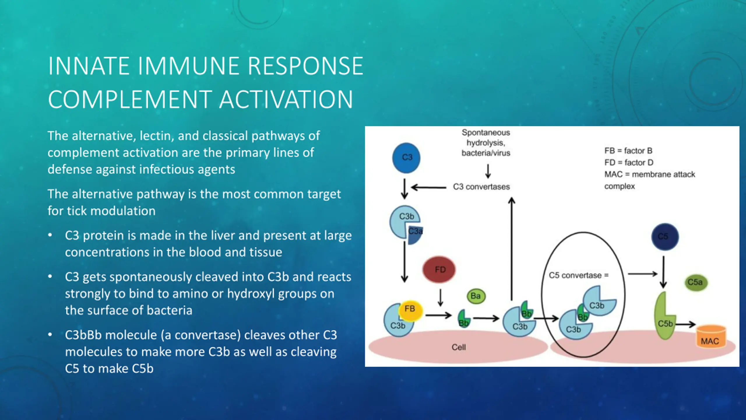 INNATE IMMUNE RESPONSE COMPLEMENT ACTIVATION The alternative, lectin, and classical pathways of complement activation are the primary lines of defense against infectious agents The alternative pathway is the most common target for tick modulation C3 protein is made in the liver and present at large concentrations in the blood and tissue C3 gets spontaneously cleaved into C3b and reacts strongly to bind to amino or hydroxyl groups on the surface of bacteria C3bBb molecule (a convertase) cleaves other C3 molecules to make more C3b as well as cleaving C5 to make C5b