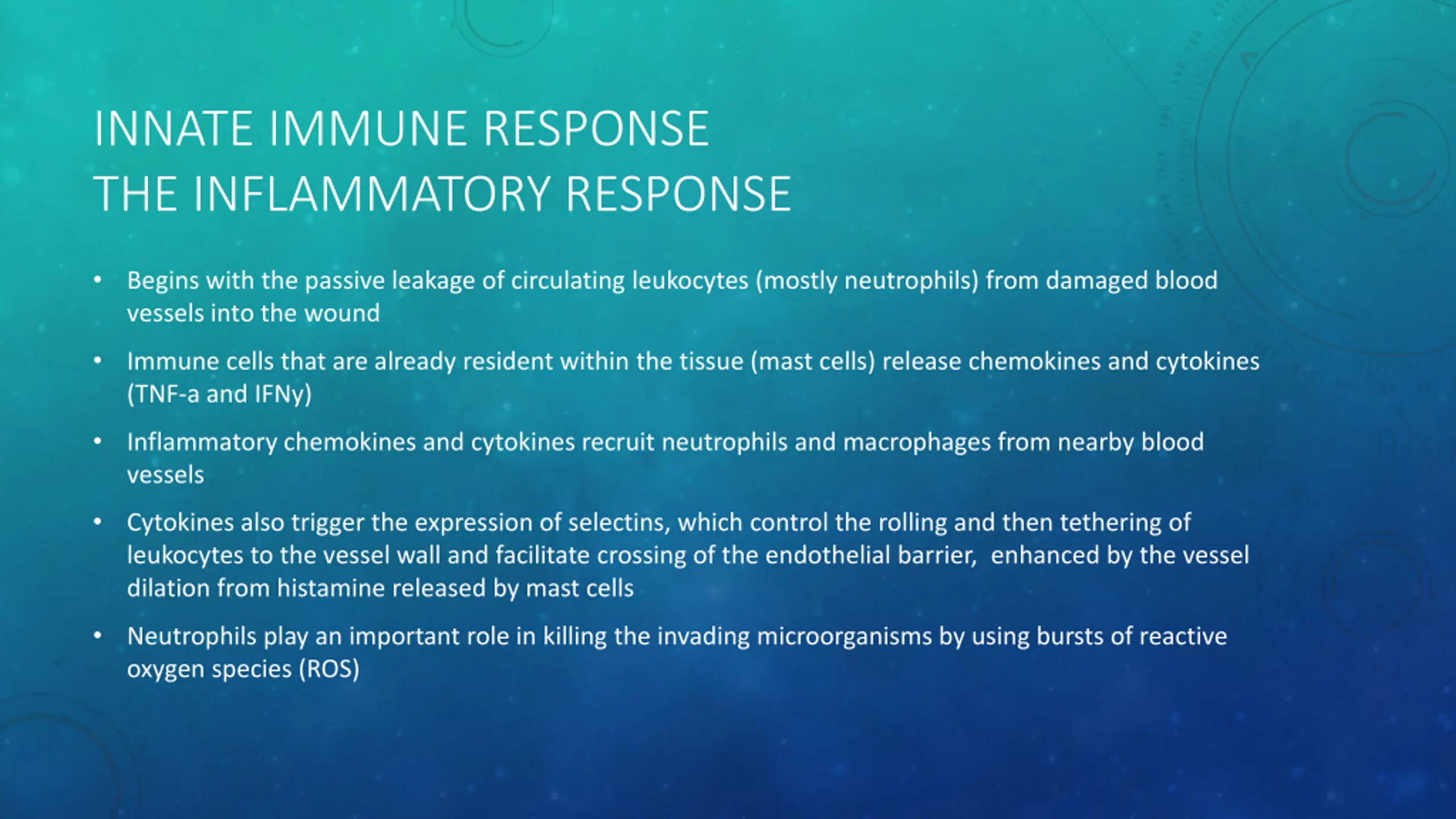 INNATE IMMUNE RESPONSE THE INFLAMMATORY RESPONSE Begins with the passive leakage of circulating leukocytes (mostly neutrophils) from damaged blood vessels into the wound Immune cells that are already resident within the tissue (mast cells) release chemokines and cytokines (TNF-a and IFNy) Inflammatory chemokines and cytokines recruit neutrophils and macrophages from nearby blood vessels Cytokines also trigger the expression of selectins, which control the rolling and then tethering of leukocytes to the vessel wall and facilitate crossing of the endothelial barrier, enhanced by the vessel dilation from histamine released by mast cells Neutrophils play an important role in killing the invading microorganisms by using bursts of reactive oxygen species (ROS)