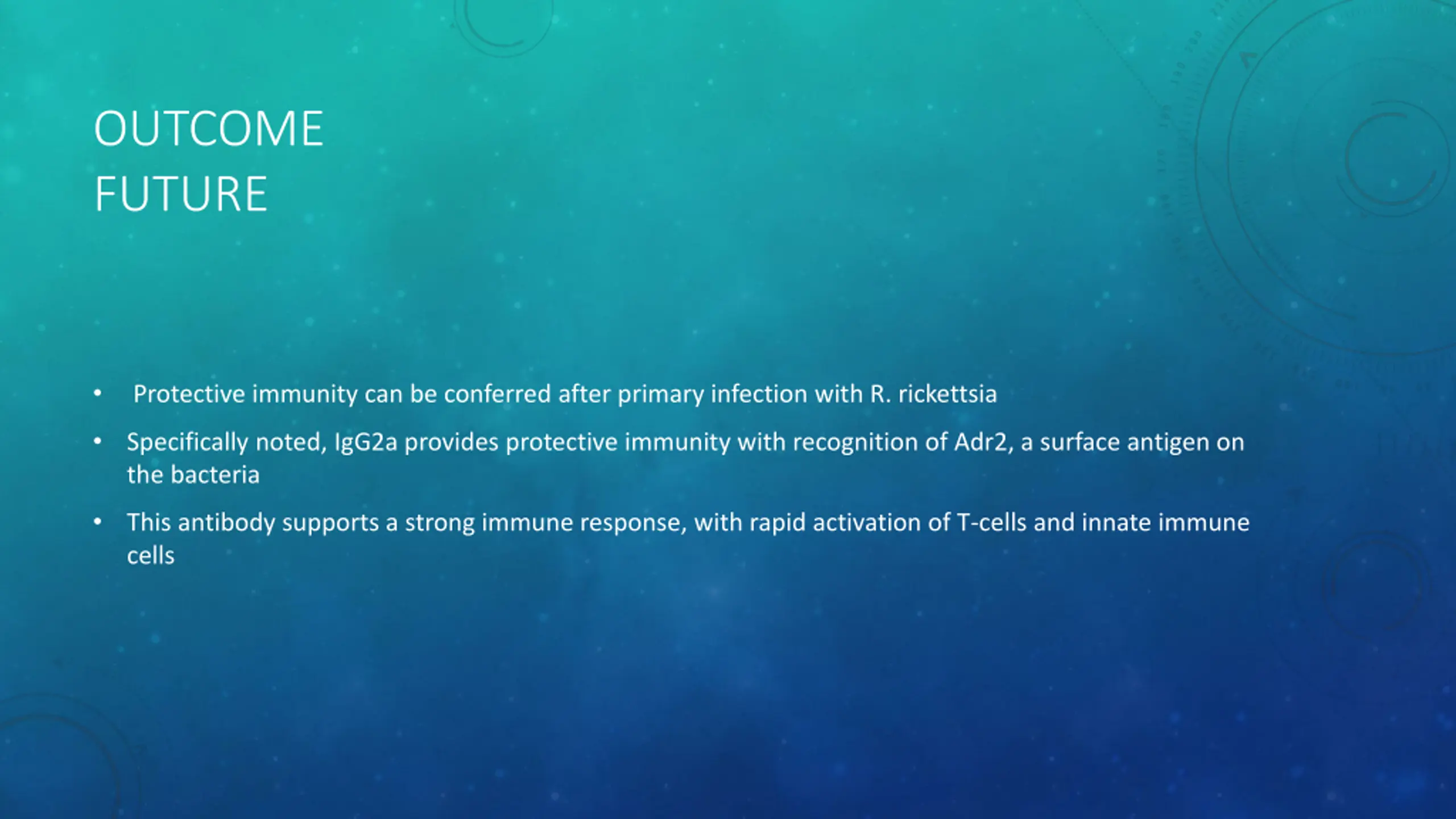 OUTCOME FUTURE Protective immunity can be conferred after primary infection with R. rickettsia Specifically noted, IgG2a provides protective immunity with recognition of Adr2, a surface antigen on the bacteria This antibody supports a strong immune response, with rapid activation of T-cells and innate immune cells