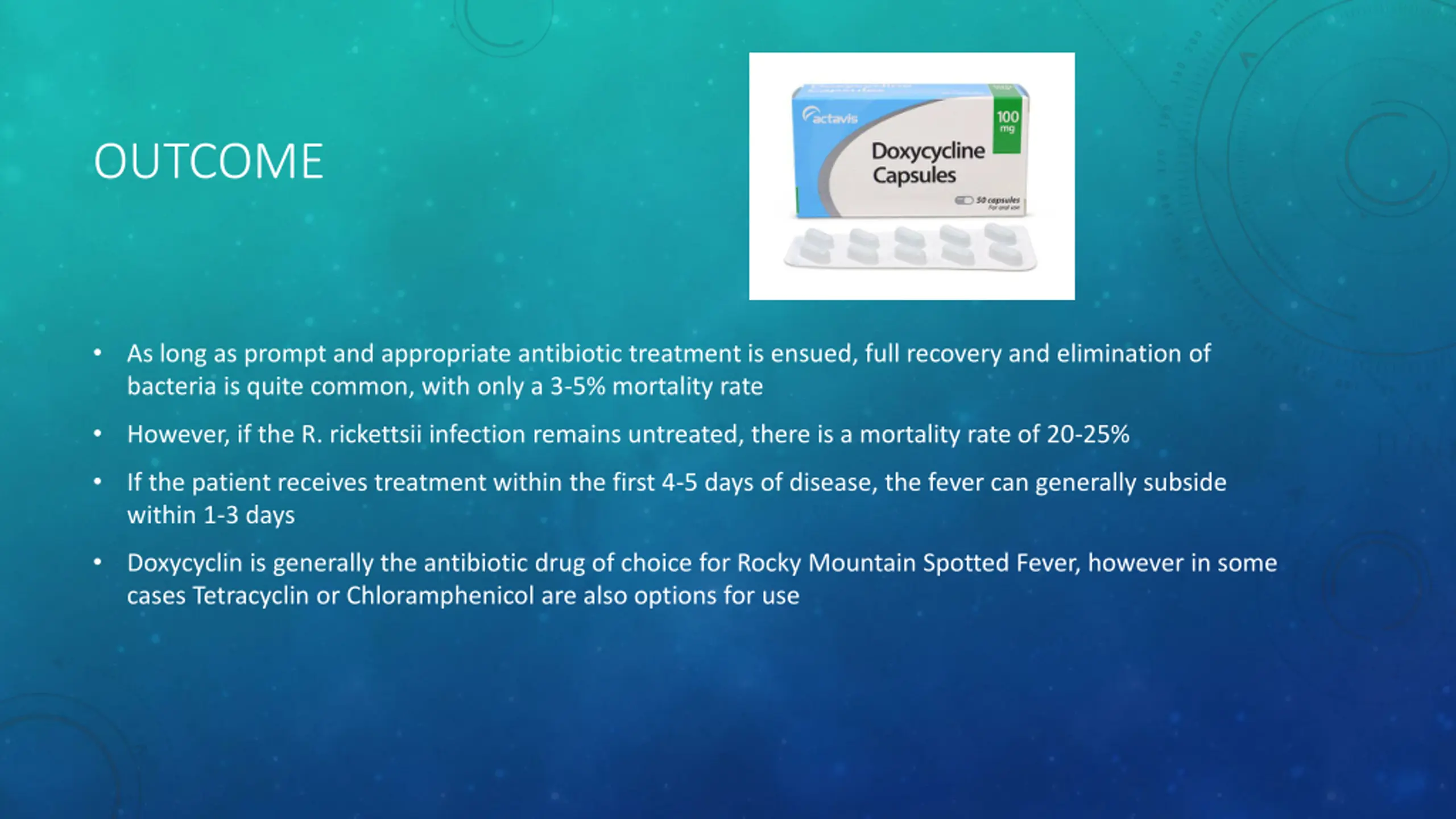 OUTCOME As long as prompt and appropriate antibiotic treatment is ensued, full recovery and elimination of bacteria is quite common, with only a 3-5% mortality rate However, if the R. rickettsii infection remains untreated, there is a mortality rate of 20-25% If the patient receives treatment within the first 4-5 days of disease, the fever can generally subside within 1-3 days Doxycyclin is generally the antibiotic drug of choice for Rocky Mountain Spotted Fever, however in some cases Tetracyclin or Chloramphenicol are also options for use