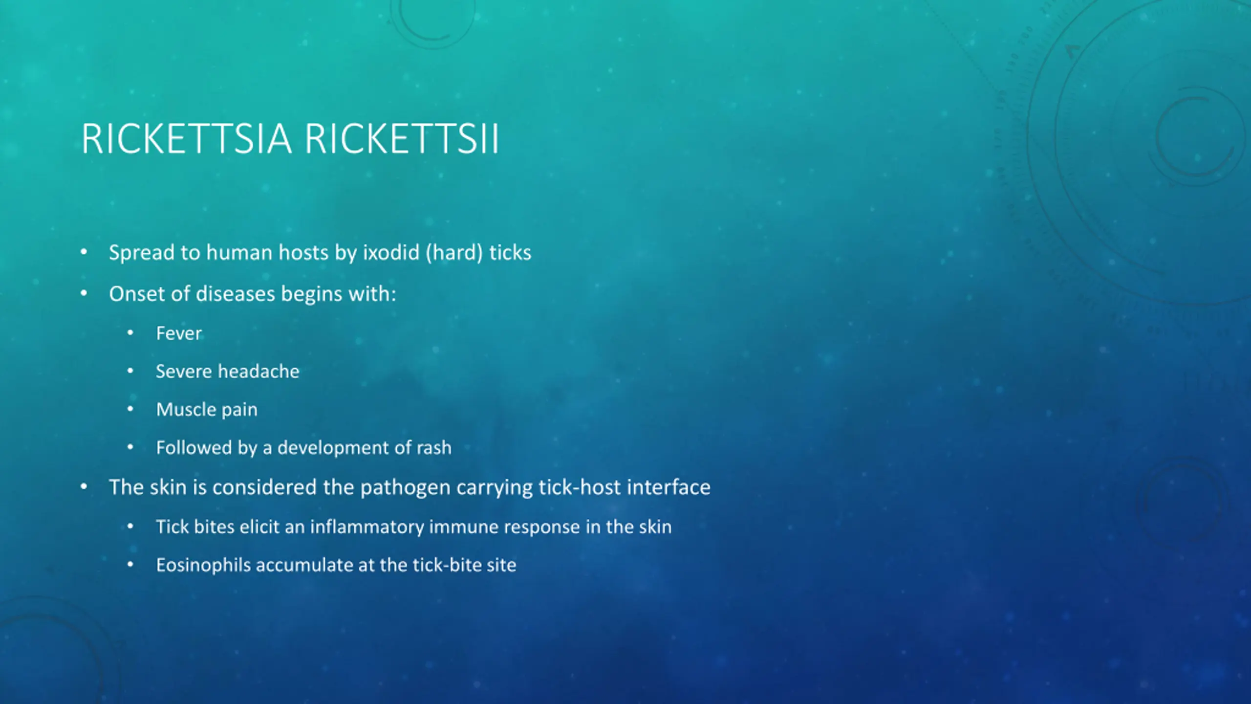 RICKETTSIA RICKETTSII Spread to human hosts by ixodid (hard) ticks Onset of diseases begins with: Fever Severe headache Muscle pain Followed by a development of rash The skin is considered the pathogen carrying tick-host interface Tick bites elicit an inflammatory immune response in the skin Eosinophils accumulate at the tick-bite site