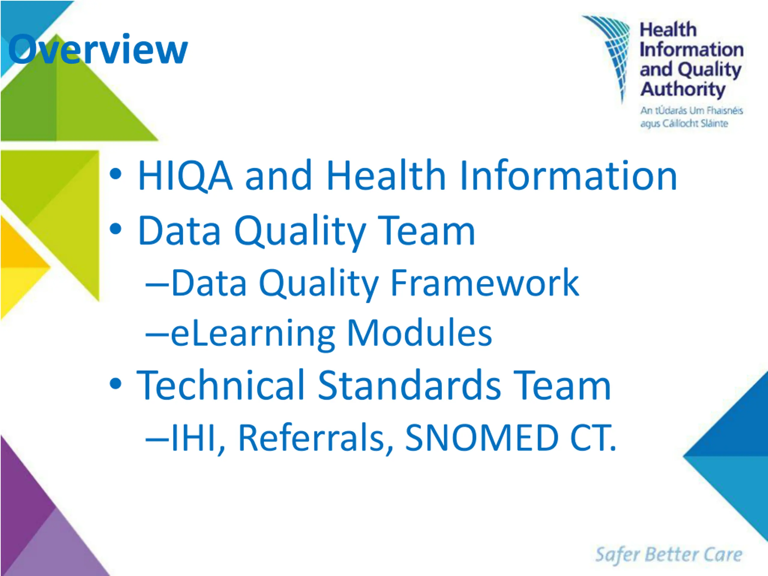 Overview HIQA and Health Information Data Quality Team Data Quality Framework eLearning Modules Technical Standards Team IHI, Referrals, SNOMED CT.