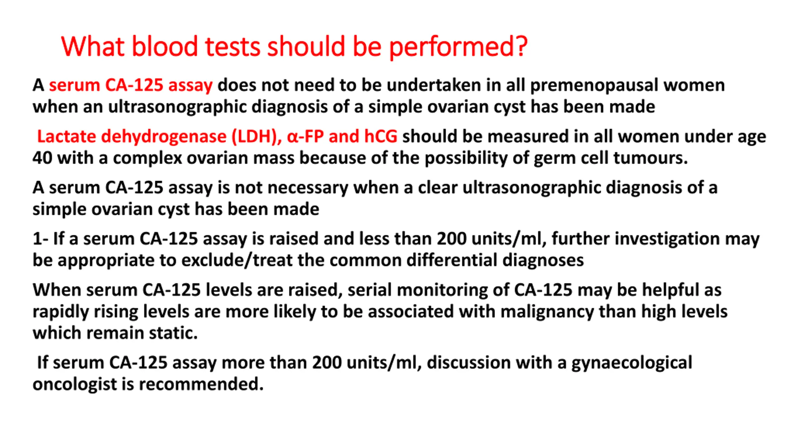 What blood tests should be performed? What blood tests should be performed? A serum CA-125 assay does not need to be undertaken in all premenopausal women when an ultrasonographic diagnosis of a simple ovarian cyst has been made Lactate dehydrogenase (LDH), -FP and hCG should be measured in all women under age 40 with a complex ovarian mass because of the possibility of germ cell tumours. A serum CA-125 assay is not necessary when a clear ultrasonographic diagnosis of a simple ovarian cyst has been made 1- If a serum CA-125 assay is raised and less than 200 units/ml, further investigation may be appropriate to exclude/treat the common differential diagnoses When serum CA-125 levels are raised, serial monitoring of CA-125 may be helpful as rapidly rising levels are more likely to be associated with malignancy than high levels which remain static. If serum CA-125 assay more than 200 units/ml, discussion with a gynaecological oncologist is recommended.
