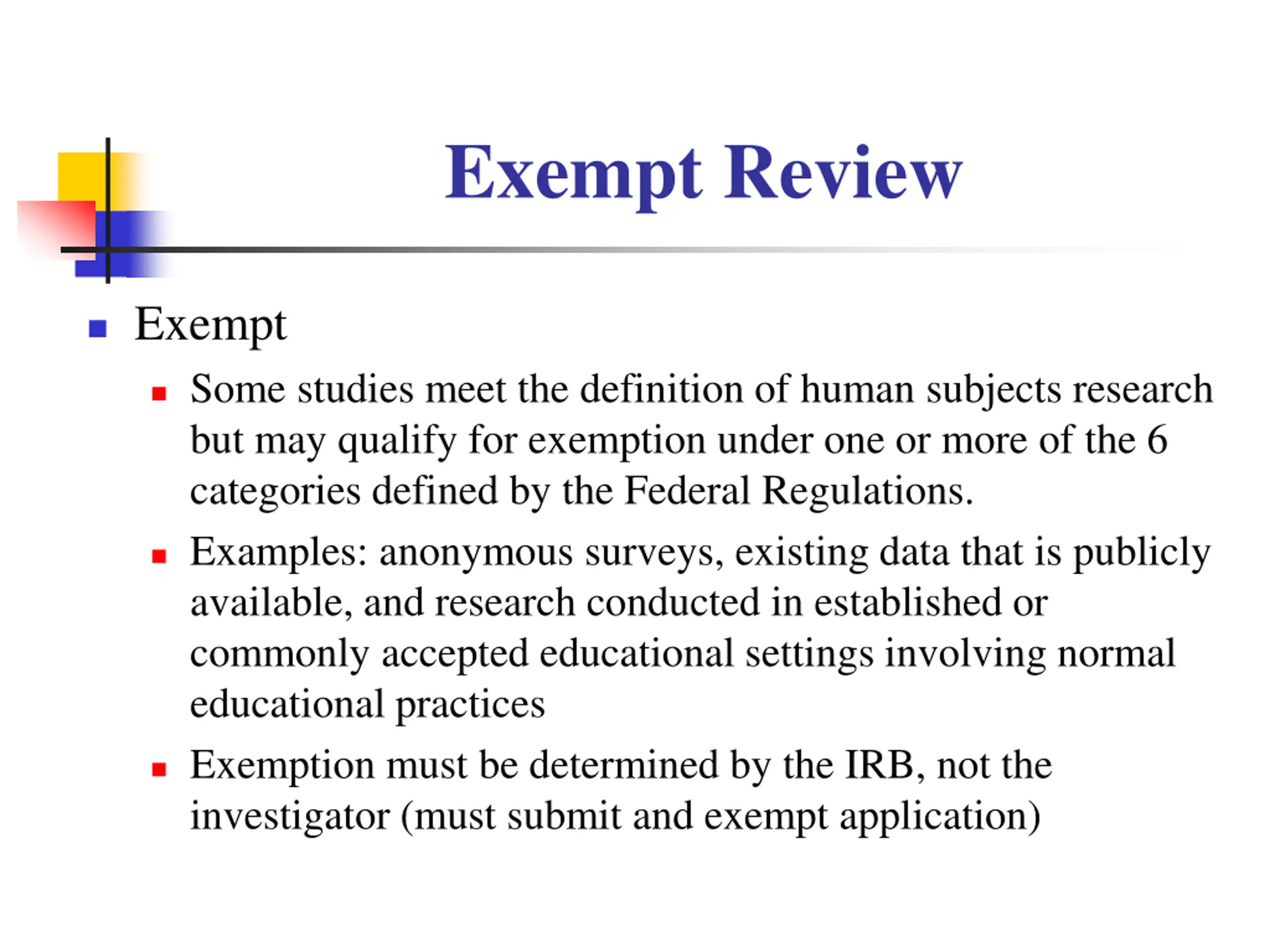 Exempt Review Exempt Some studies meet the definition of human subjects research but may qualify for exemption under one or more of the 6 categories defined by the Federal Regulations. Examples: anonymous surveys, existing data that is publicly available, and research conducted in established or commonly accepted educational settings involving normal educational practices Exemption must be determined by the IRB, not the investigator (must submit and exempt application)