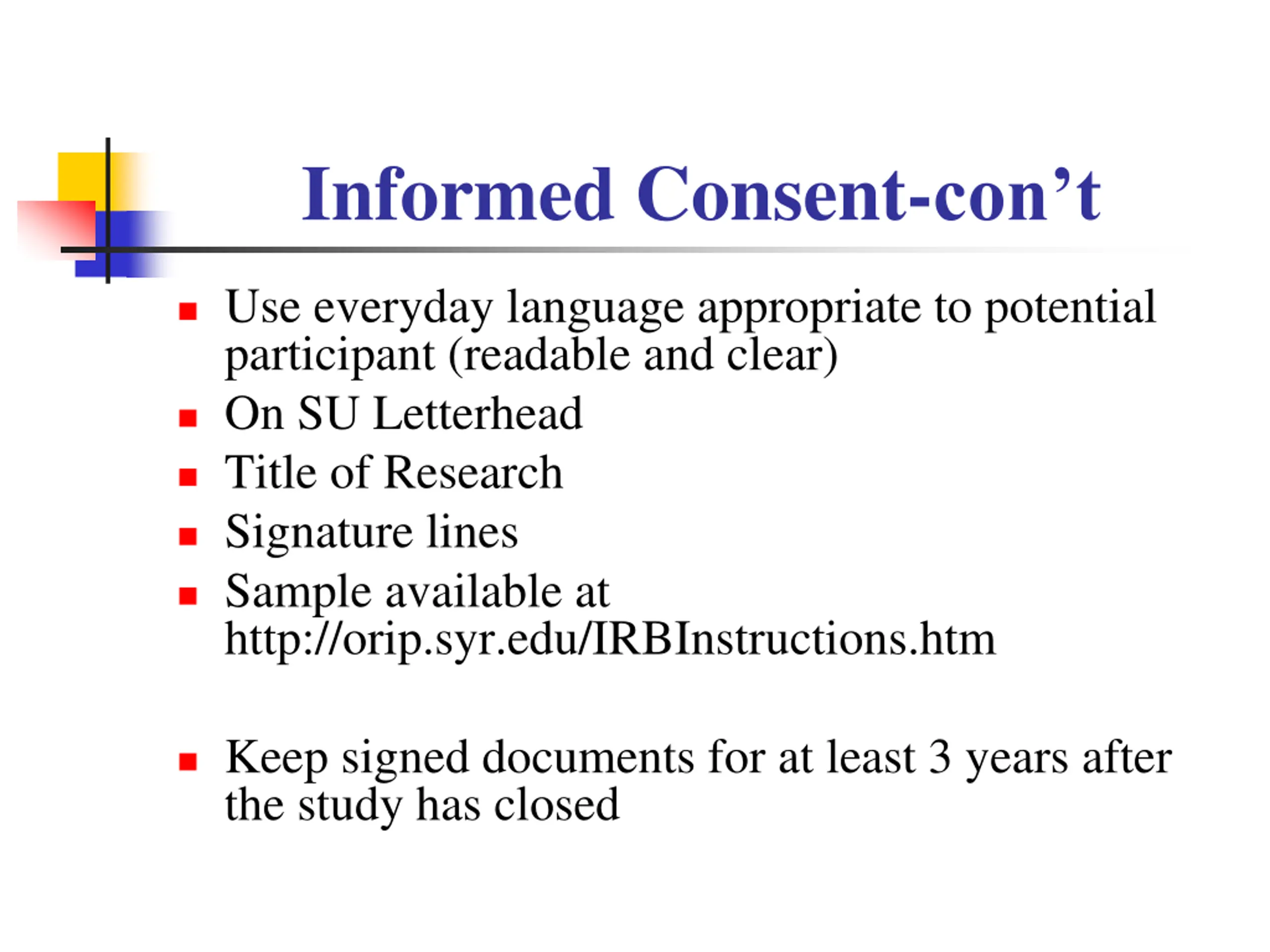 Informed Consent-cont Use everyday language appropriate to potential participant (readable and clear) On SU Letterhead Title of Research Signature lines Sample available at http://orip.syr.edu/IRBInstructions.htm Keep signed documents for at least 3 years after the study has closed