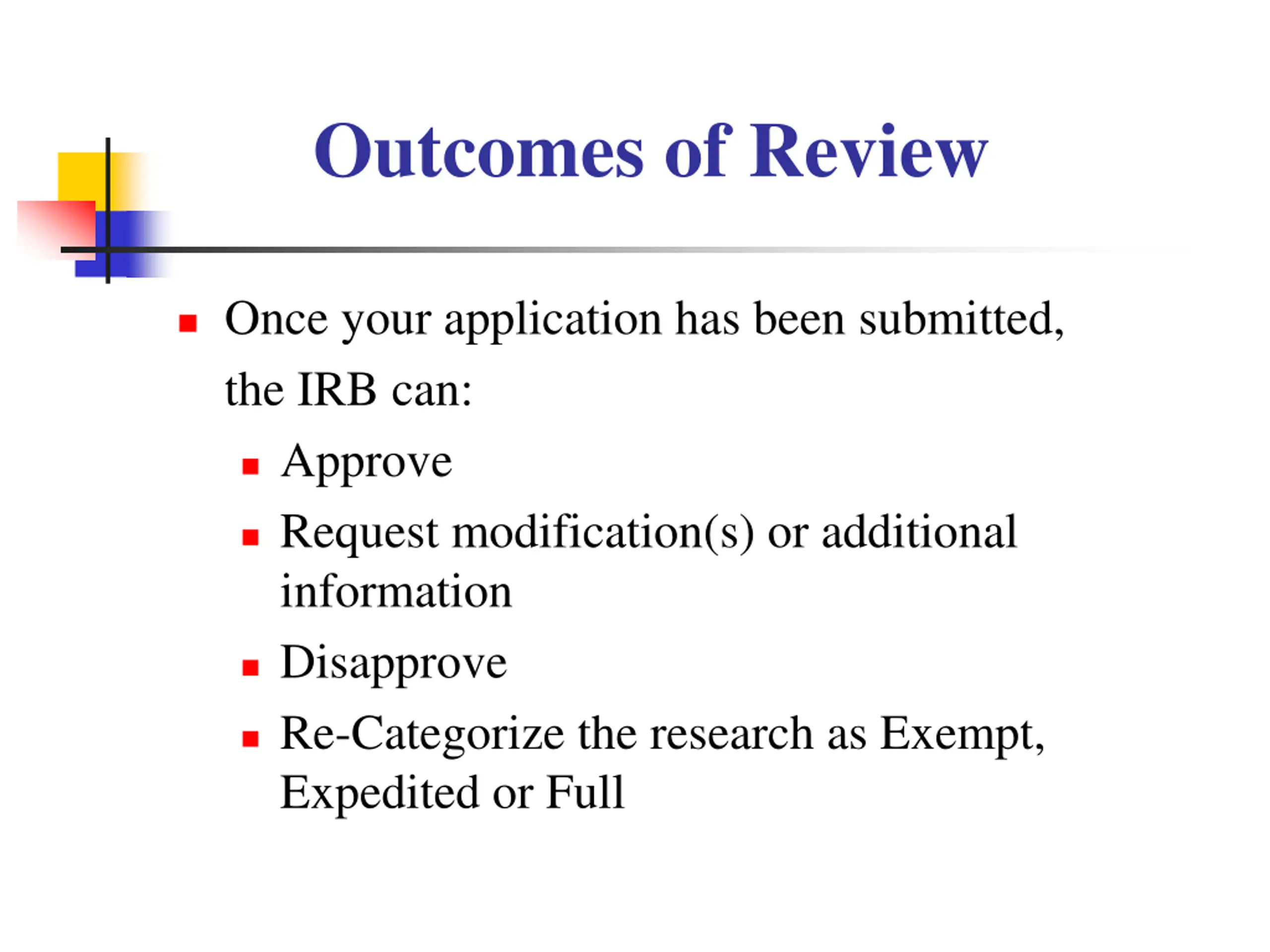 Outcomes of Review Once your application has been submitted, the IRB can: Approve Request modification(s) or additional information Disapprove Re-Categorize the research as Exempt, Expedited or Full