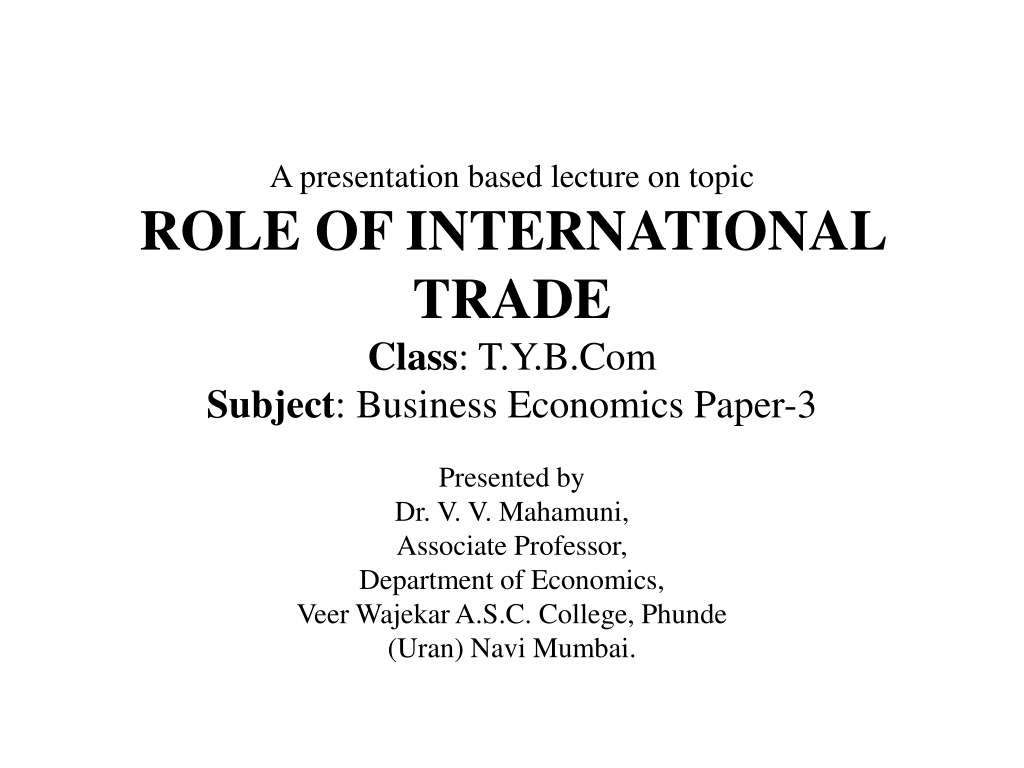 A presentation based lecture on topic ROLE OF INTERNATIONAL TRADE Class: T.Y.B.Com Subject: Business Economics Paper-3 Presented by Dr. V. V. Mahamuni, Associate Professor, Department of Economics, Veer Wajekar A.S.C. College, Phunde (Uran) Navi Mumbai.