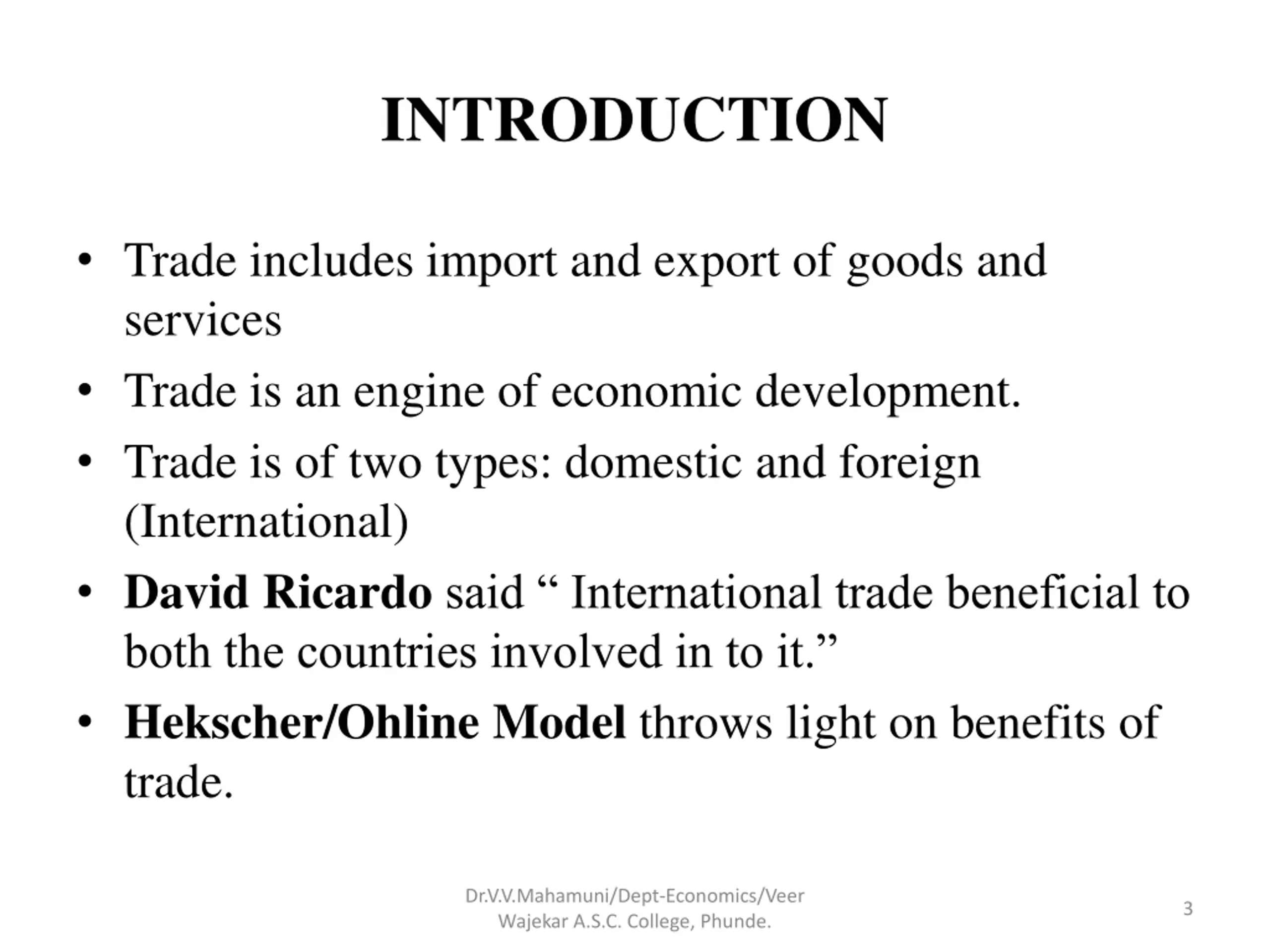INTRODUCTION Trade includes import and export of goods and services Trade is an engine of economic development. Trade is of two types: domestic and foreign (International) David Ricardo said International trade beneficial to both the countries involved in to it. Hekscher/Ohline Model throws light on benefits of trade. Dr.V.V.Mahamuni/Dept-Economics/Veer Wajekar A.S.C. College, Phunde. 3