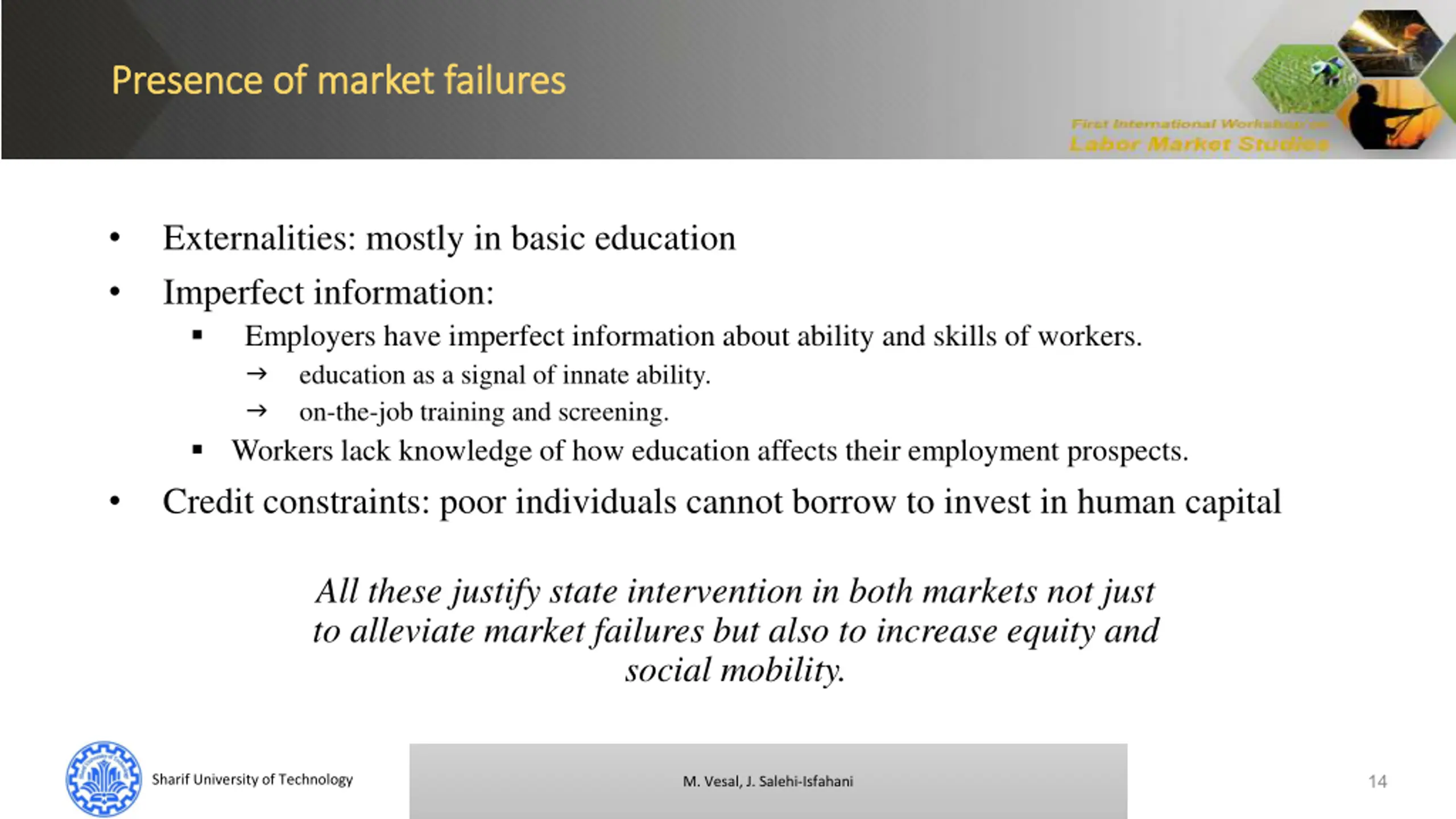 Presence of market failures Presence of market failures Externalities: mostly in basic education Imperfect information: Employers have imperfect information about ability and skills of workers. education as a signal of innate ability. on-the-job training and screening. Workers lack knowledge of how education affects their employment prospects. Credit constraints: poor individuals cannot borrow to invest in human capital All these justify state intervention in both markets not just to alleviate market failures but also to increase equity and social mobility. 14 Sharif University of Technology M. Vesal, J. Salehi-Isfahani