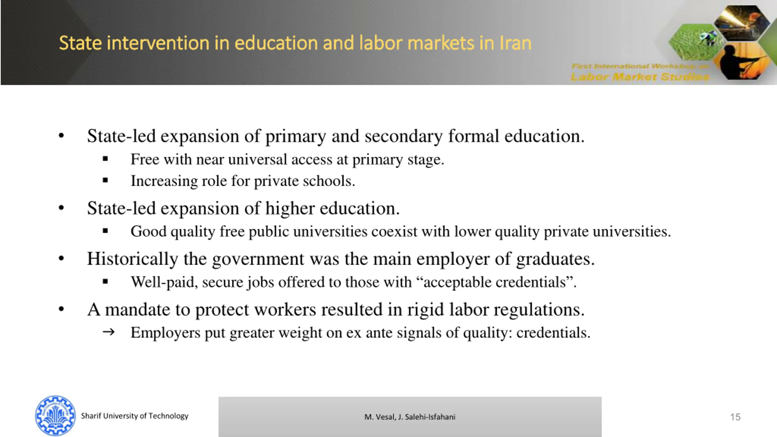 State intervention in education and labor markets State intervention in education and labor markets in Iran in Iran State-led expansion of primary and secondary formal education. Free with near universal access at primary stage. Increasing role for private schools. State-led expansion of higher education. Good quality free public universities coexist with lower quality private universities. Historically the government was the main employer of graduates. Well-paid, secure jobs offered to those with acceptable credentials . A mandate to protect workers resulted in rigid labor regulations. Employers put greater weight on ex ante signals of quality: credentials. 15 Sharif University of Technology M. Vesal, J. Salehi-Isfahani