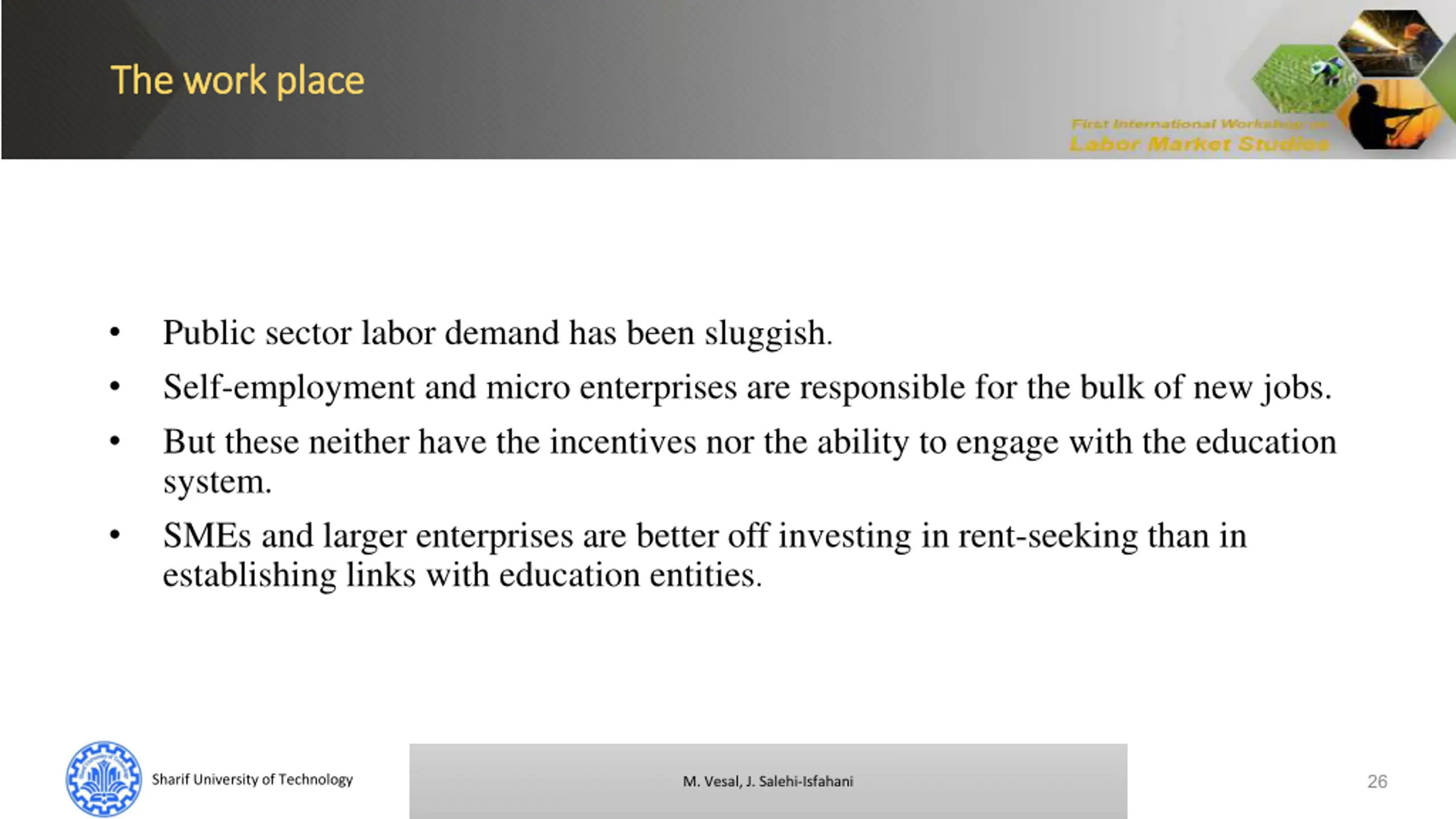 The work place The work place Public sector labor demand has been sluggish. Self-employment and micro enterprises are responsible for the bulk of new jobs. But these neither have the incentives nor the ability to engage with the education system. SMEs and larger enterprises are better off investing in rent-seeking than in establishing links with education entities. 26 Sharif University of Technology M. Vesal, J. Salehi-Isfahani