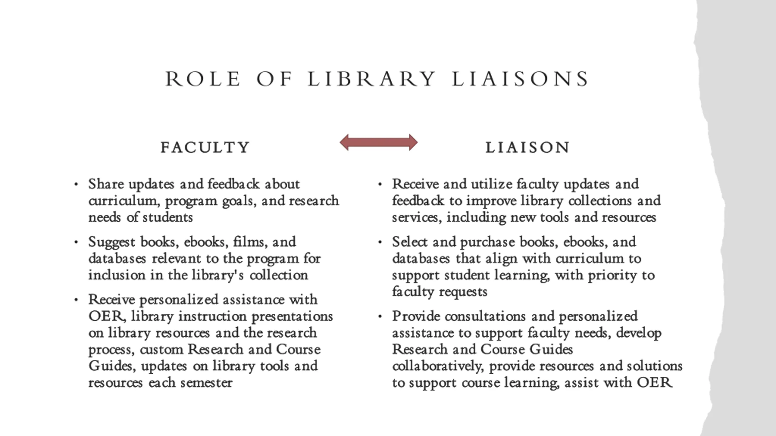 Enhance academic outreach for students through library resources, facilitate faculty needs, and curate relevant materials to support curriculum. Library liaisons play a vital role in sharing updates, aligning resources with program goals, and providing personalized assistance to faculty members. Their responsibilities include suggesting books, films, and databases, developing Research and Course Guides, and collaborating with faculty to enhance the learning experience.
