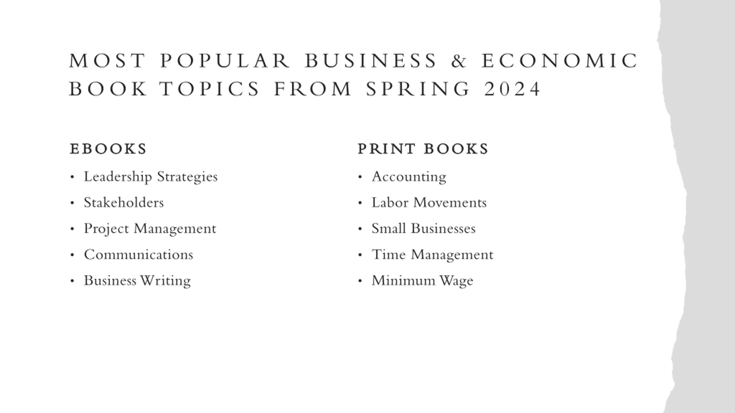 M O S T P O P U L A R BU S I N E S S & E C O N O M I C B O O K TO P I C S F RO M S P R I N G 2 0 2 4 E BOOKS E BOOKS P RINT BOOKS P RINT BOOKS Leadership Strategies Accounting Stakeholders Labor Movements Project Management Small Businesses Communications Time Management Business Writing Minimum Wage
