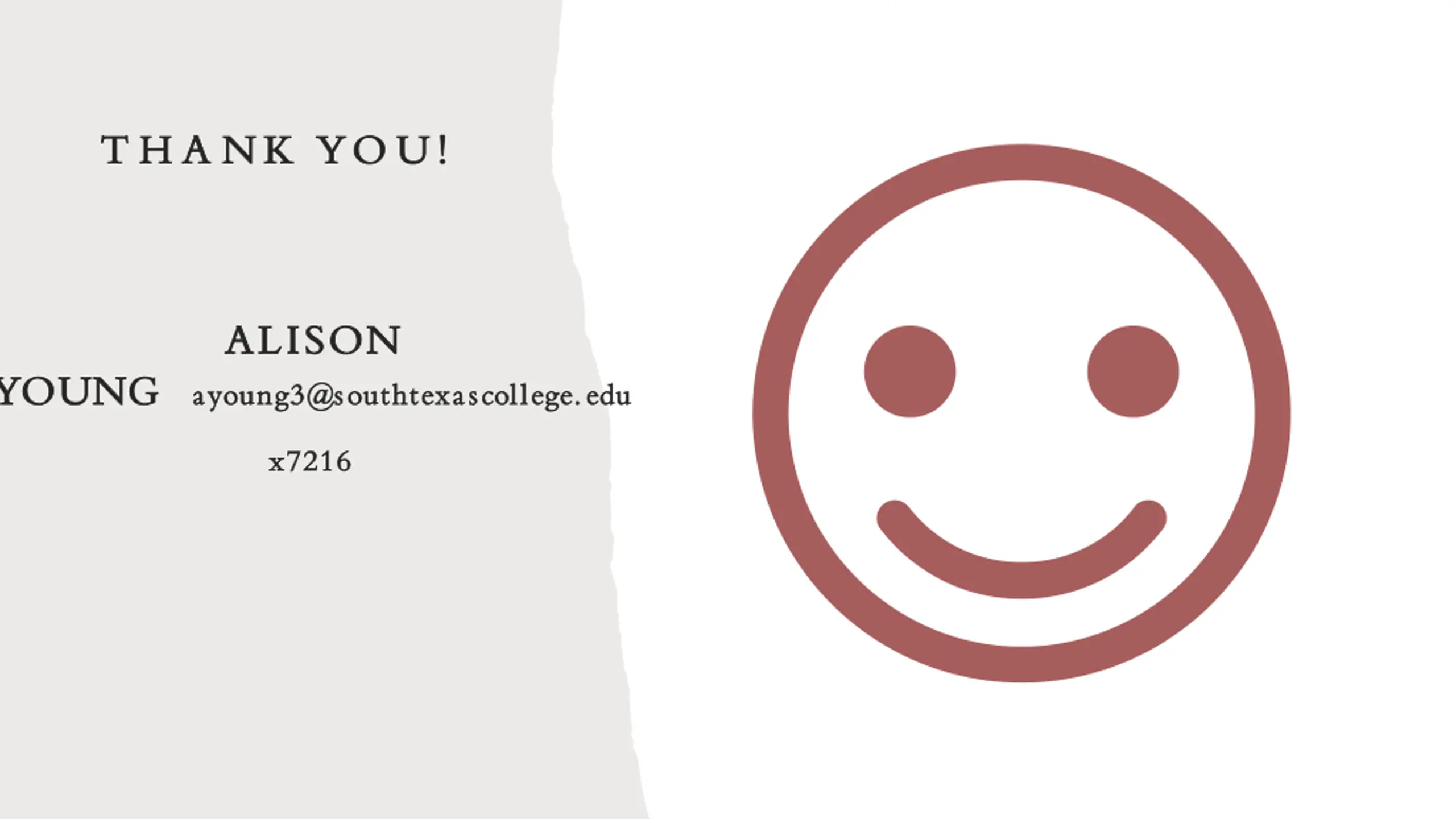 T H A NK YO U! T H A NK YO U! ALISON ALISON ayoung3@southtexascollege.edu YOUNG YOUNG ayoung3@southtexascollege.edu x7216 x7216