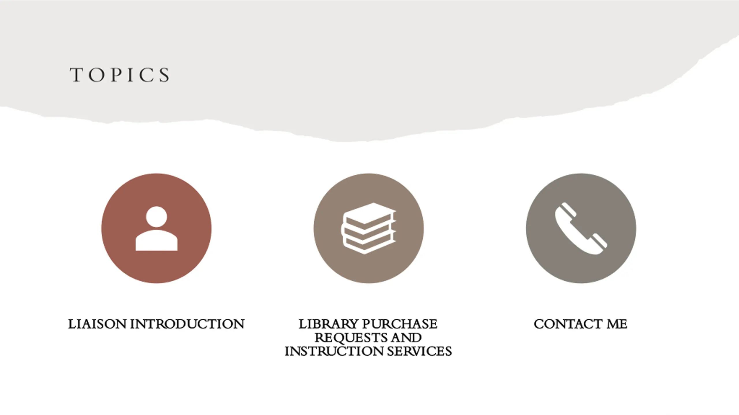 TO P I C S LIAISON INTRODUCTION LIAISON INTRODUCTION LIBRAR Y PURCHASE LIBRAR Y PURCHASE REQUESTS AND REQUESTS AND INSTRUCTION SER VICES INSTRUCTION SER VICES CONTACT ME CONTACT ME