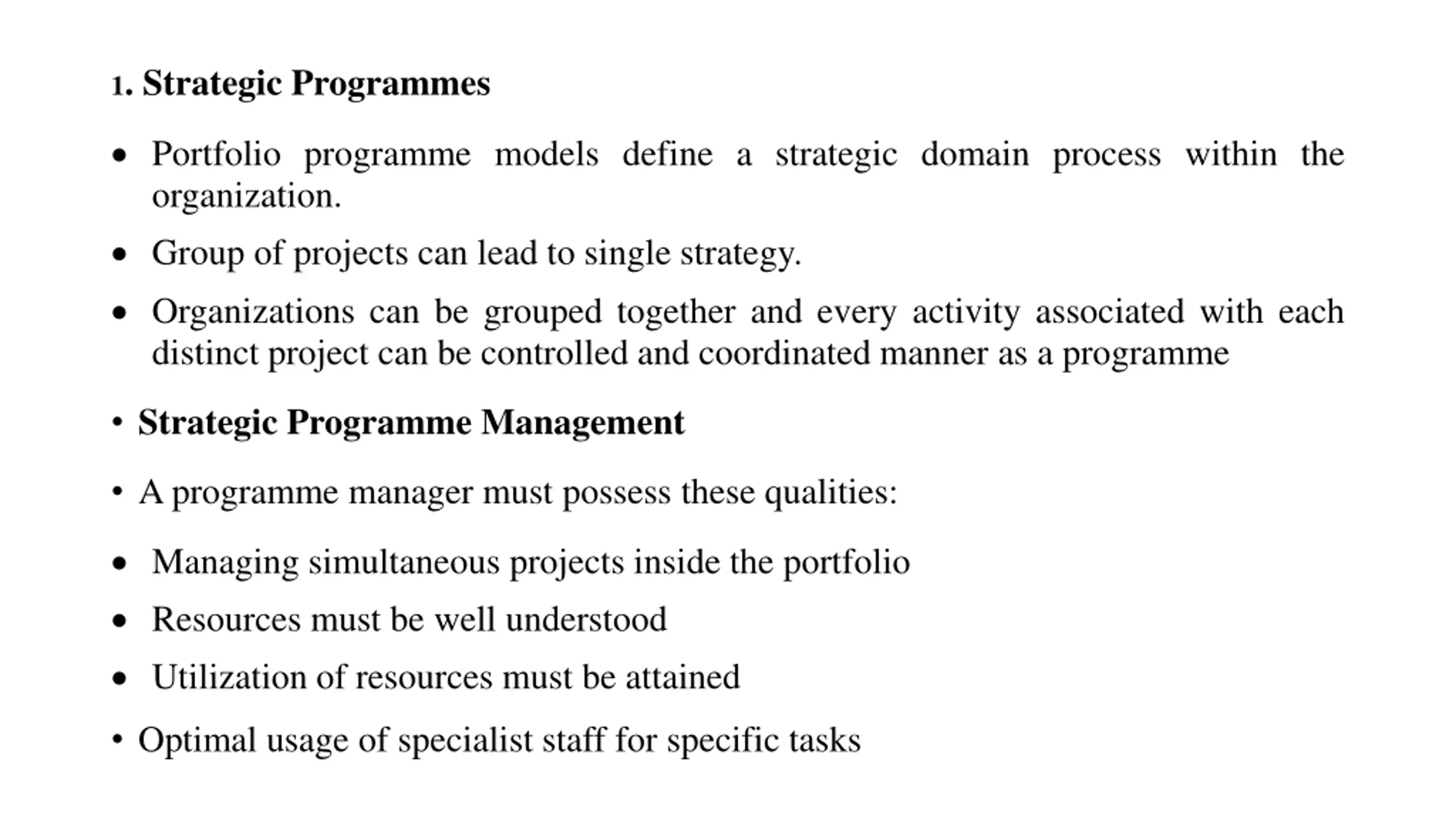 1. Strategic Programmes Portfolio programme models define a strategic domain process within the organization. Group of projects can lead to single strategy. Organizations can be grouped together and every activity associated with each distinct project can be controlled and coordinated manner as a programme Strategic Programme Management A programme manager must possess these qualities: Managing simultaneous projects inside the portfolio Resources must be well understood Utilization of resources must be attained Optimal usage of specialist staff for specific tasks