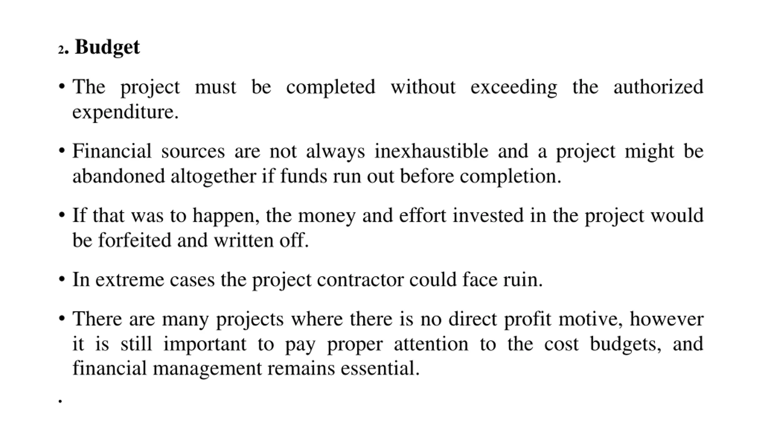 2. Budget The project must be completed without exceeding the authorized expenditure. Financial sources are not always inexhaustible and a project might be abandoned altogether if funds run out before completion. If that was to happen, the money and effort invested in the project would be forfeited and written off. In extreme cases the project contractor could face ruin. There are many projects where there is no direct profit motive, however it is still important to pay proper attention to the cost budgets, and financial management remains essential.