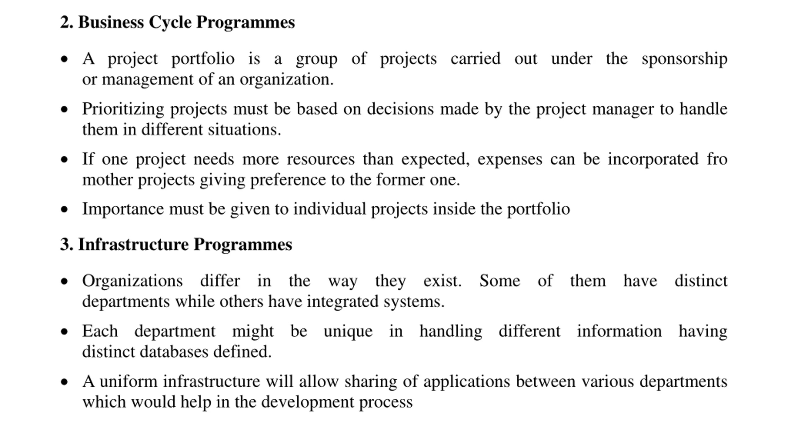 2. Business Cycle Programmes A project portfolio is a group of projects carried out under the sponsorship or management of an organization. Prioritizing projects must be based on decisions made by the project manager to handle them in different situations. If one project needs more resources than expected, expenses can be incorporated fro mother projects giving preference to the former one. Importance must be given to individual projects inside the portfolio 3. Infrastructure Programmes Organizations differ in the way they exist. Some of them have distinct departments while others have integrated systems. Each department might be unique in handling different information having distinct databases defined. A uniform infrastructure will allow sharing of applications between various departments which would help in the development process