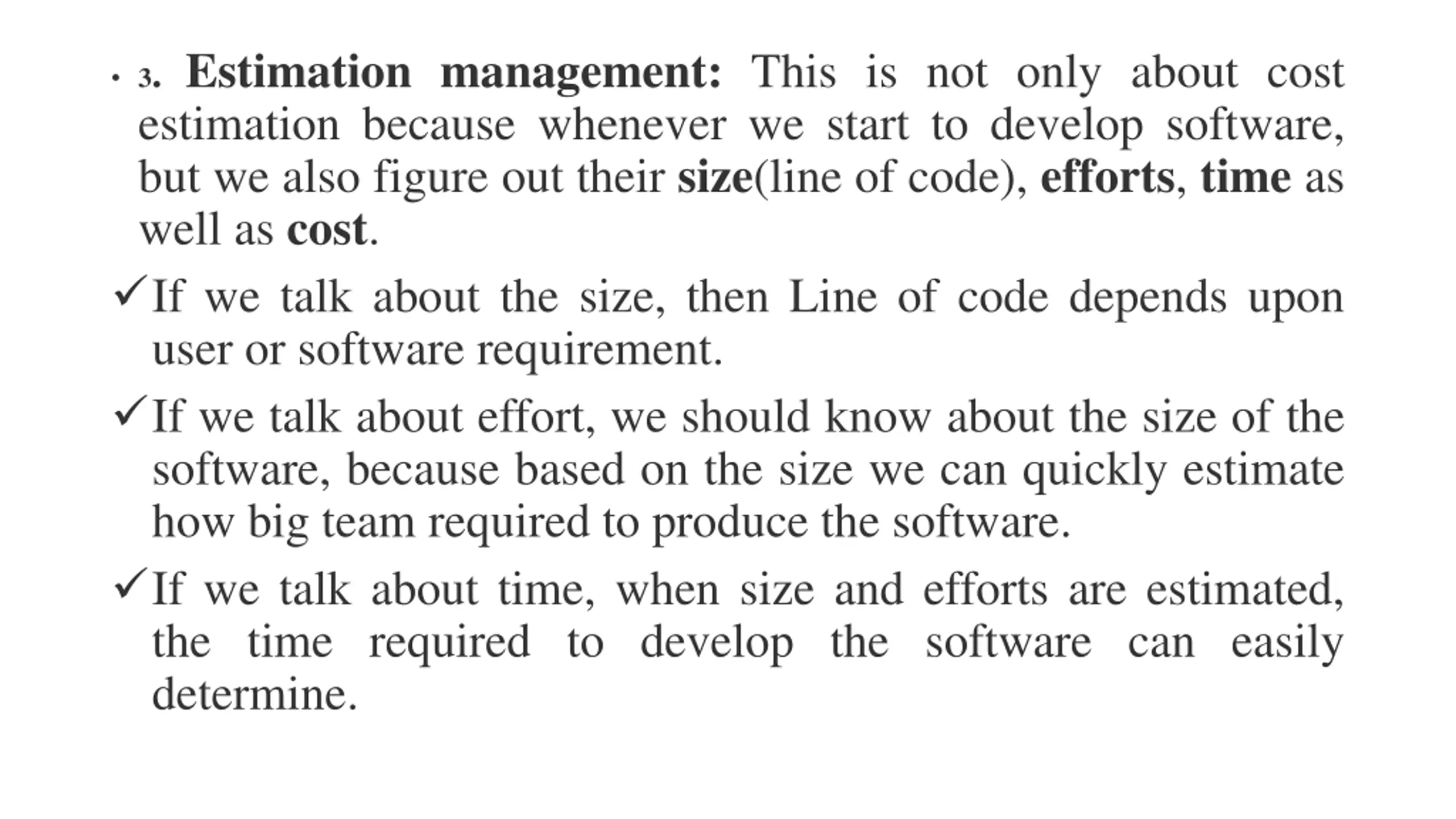3. Estimation management: This is not only about cost estimation because whenever we start to develop software, but we also figure out their size(line of code), efforts, time as well as cost. If we talk about the size, then Line of code depends upon user or software requirement. If we talk about effort, we should know about the size of the software, because based on the size we can quickly estimate how big team required to produce the software. If we talk about time, when size and efforts are estimated, the time required to develop the software can easily determine.