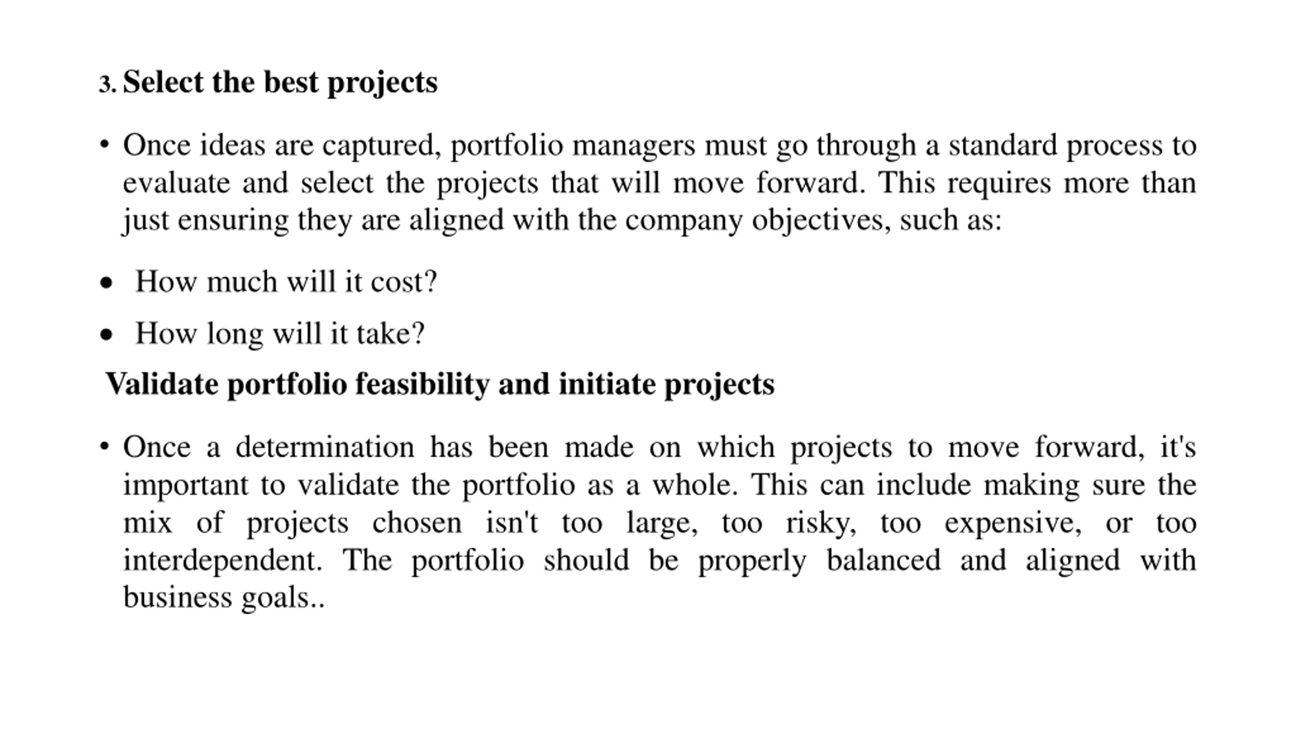 3. Select the best projects Once ideas are captured, portfolio managers must go through a standard process to evaluate and select the projects that will move forward. This requires more than just ensuring they are aligned with the company objectives, such as: How much will it cost? How long will it take? Validate portfolio feasibility and initiate projects Once a determination has been made on which projects to move forward, it's important to validate the portfolio as a whole. This can include making sure the mix of projects chosen isn't too large, too risky, too expensive, or too interdependent. The portfolio should be properly balanced and aligned with business goals..