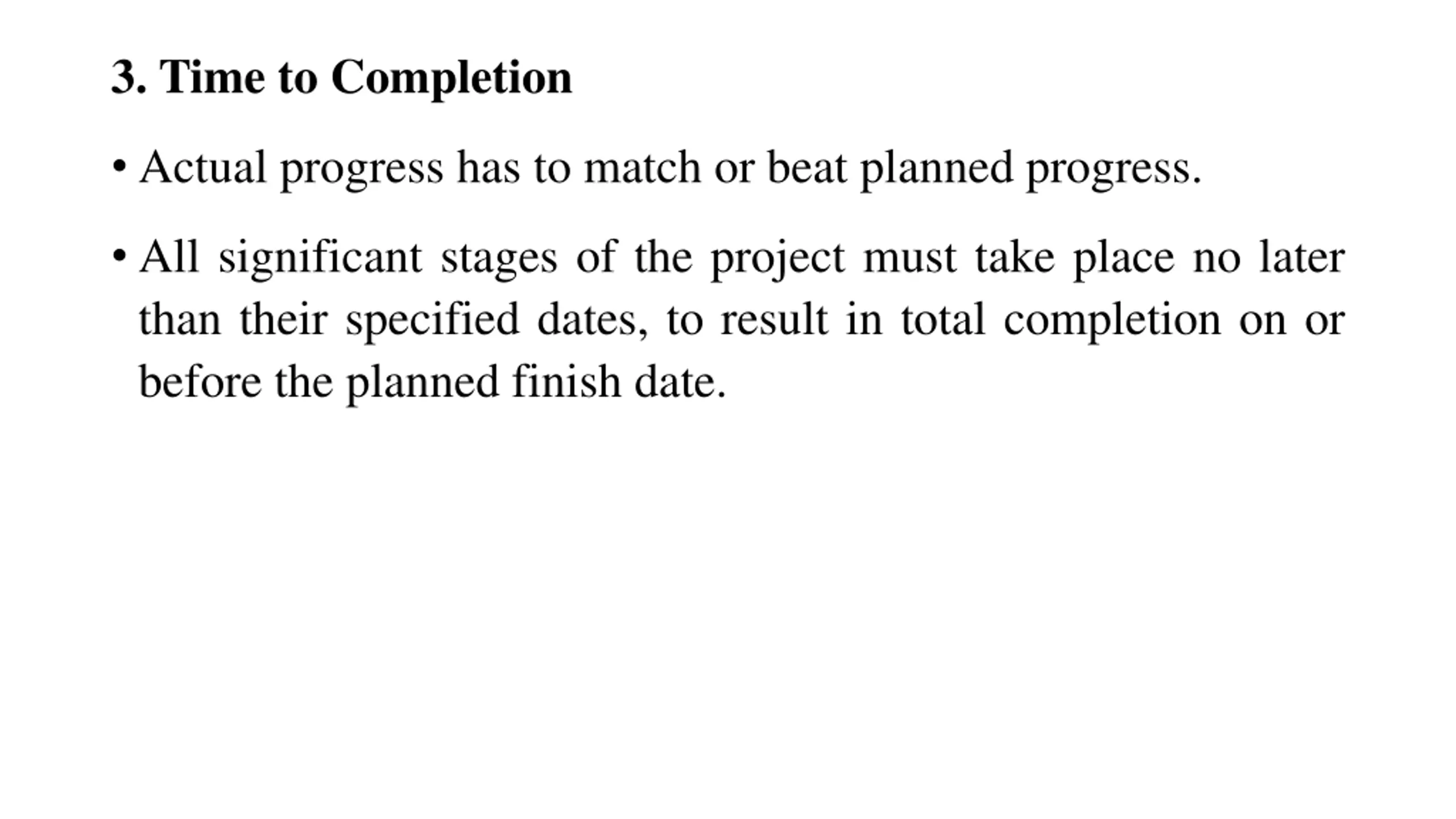 3. Time to Completion Actual progress has to match or beat planned progress. All significant stages of the project must take place no later than their specified dates, to result in total completion on or before the planned finish date.