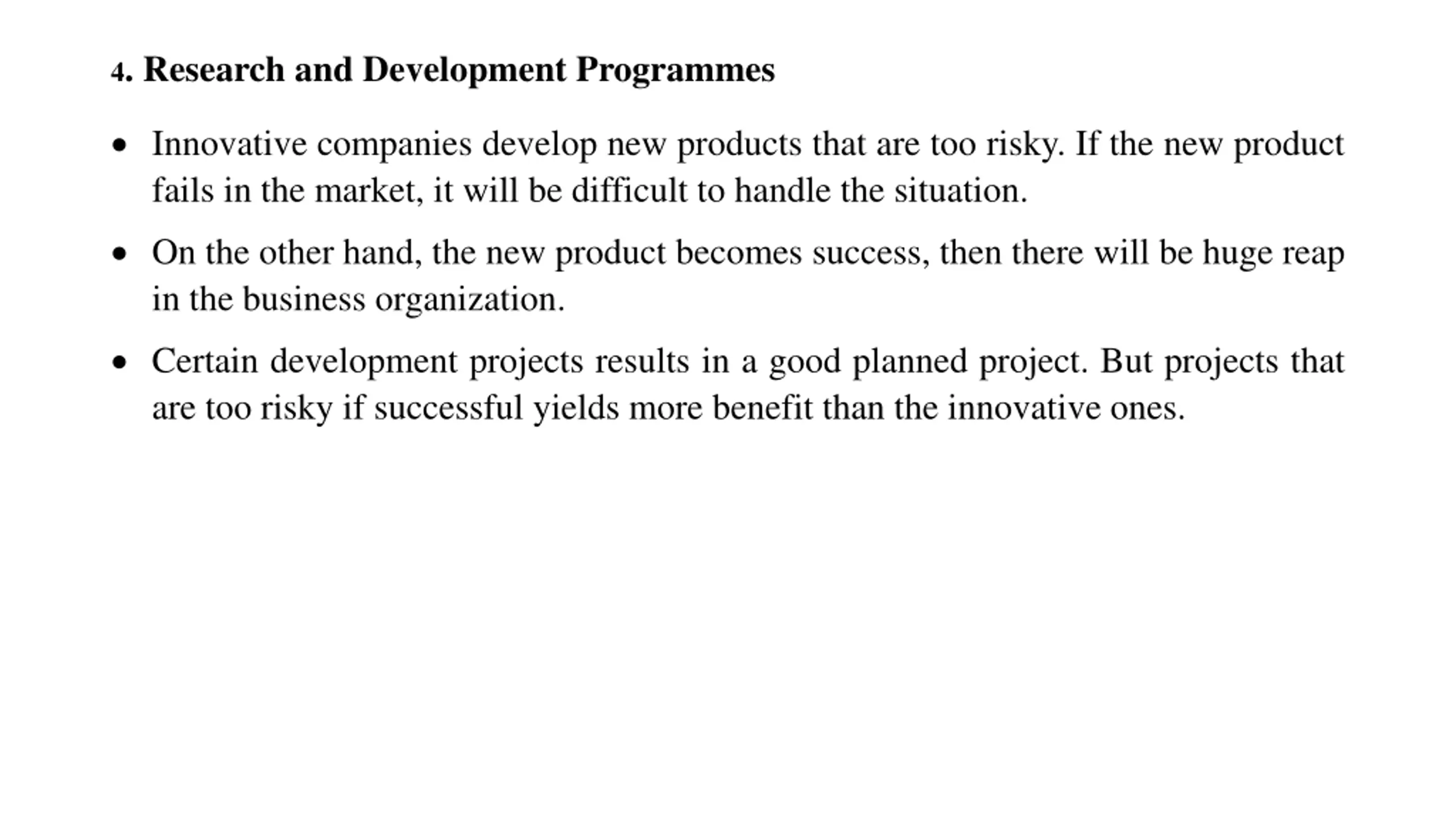 4. Research and Development Programmes Innovative companies develop new products that are too risky. If the new product fails in the market, it will be difficult to handle the situation. On the other hand, the new product becomes success, then there will be huge reap in the business organization. Certain development projects results in a good planned project. But projects that are too risky if successful yields more benefit than the innovative ones.