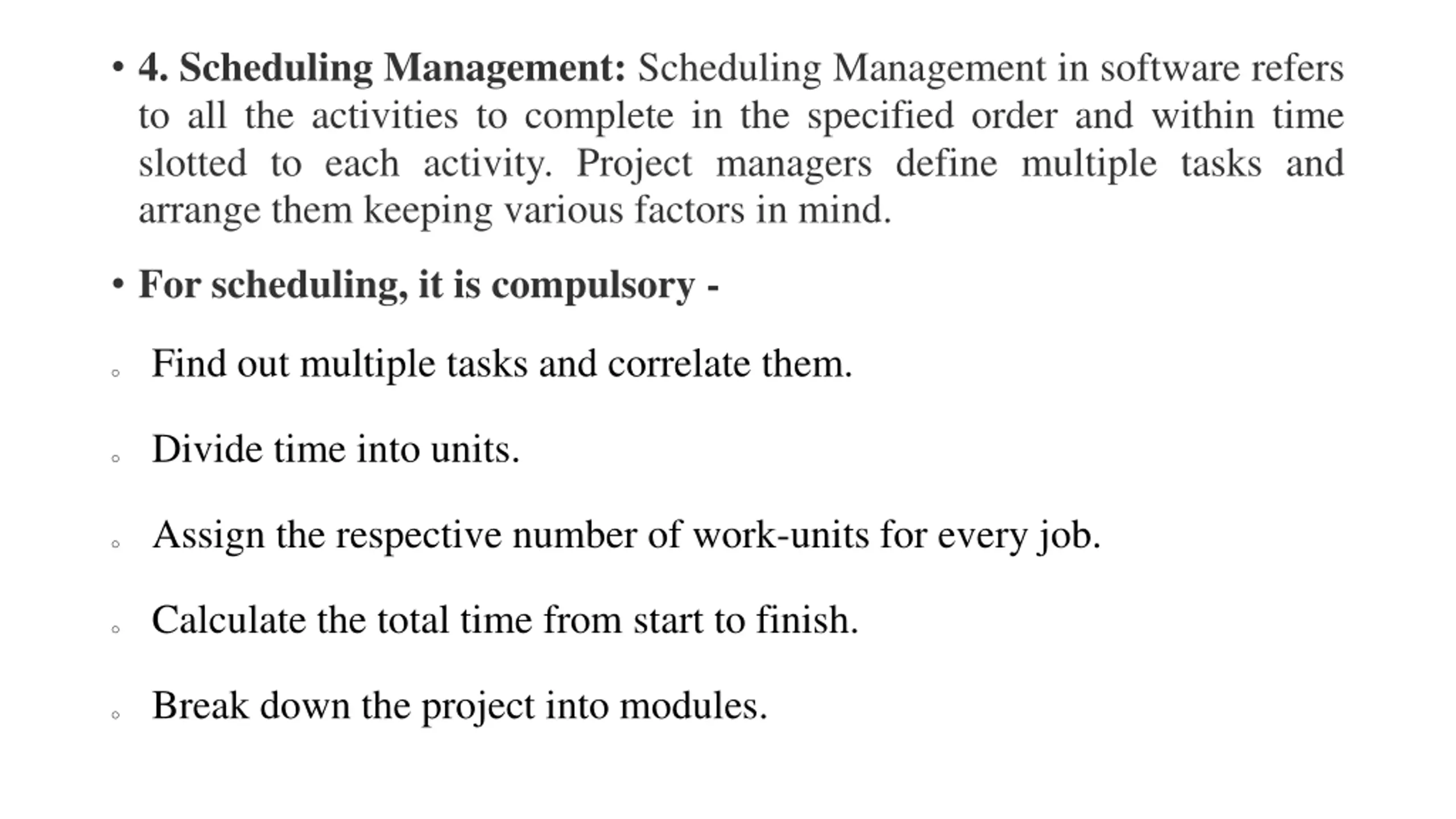 4. Scheduling Management: Scheduling Management in software refers to all the activities to complete in the specified order and within time slotted to each activity. Project managers define multiple tasks and arrange them keeping various factors in mind. For scheduling, it is compulsory - o Find out multiple tasks and correlate them. o Divide time into units. o Assign the respective number of work-units for every job. o Calculate the total time from start to finish. o Break down the project into modules.