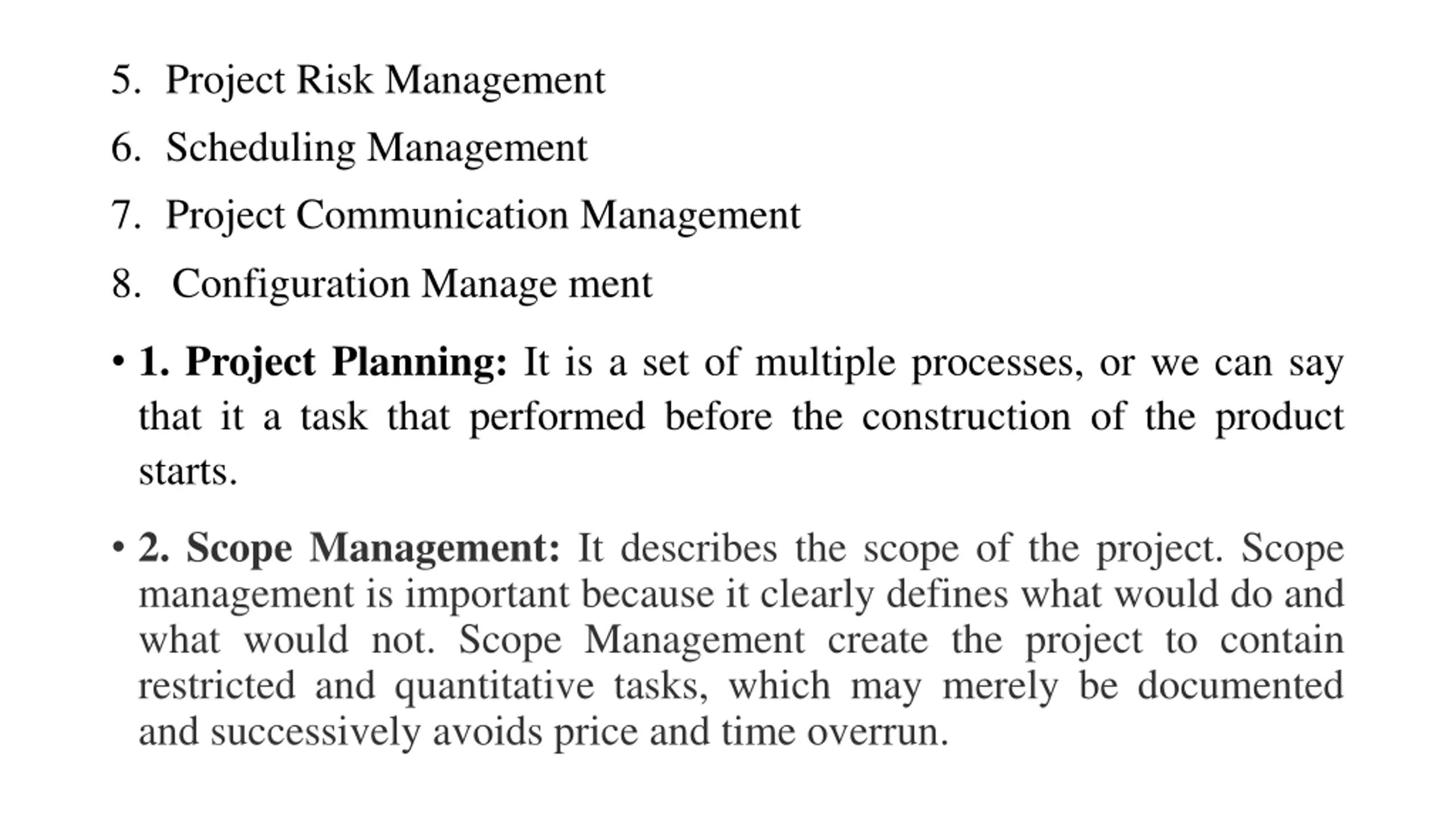 5. Project Risk Management 6. Scheduling Management 7. Project Communication Management 8. Configuration Manage ment 1. Project Planning: It is a set of multiple processes, or we can say that it a task that performed before the construction of the product starts. 2. Scope Management: It describes the scope of the project. Scope management is important because it clearly defines what would do and what would not. Scope Management create the project to contain restricted and quantitative tasks, which may merely be documented and successively avoids price and time overrun.
