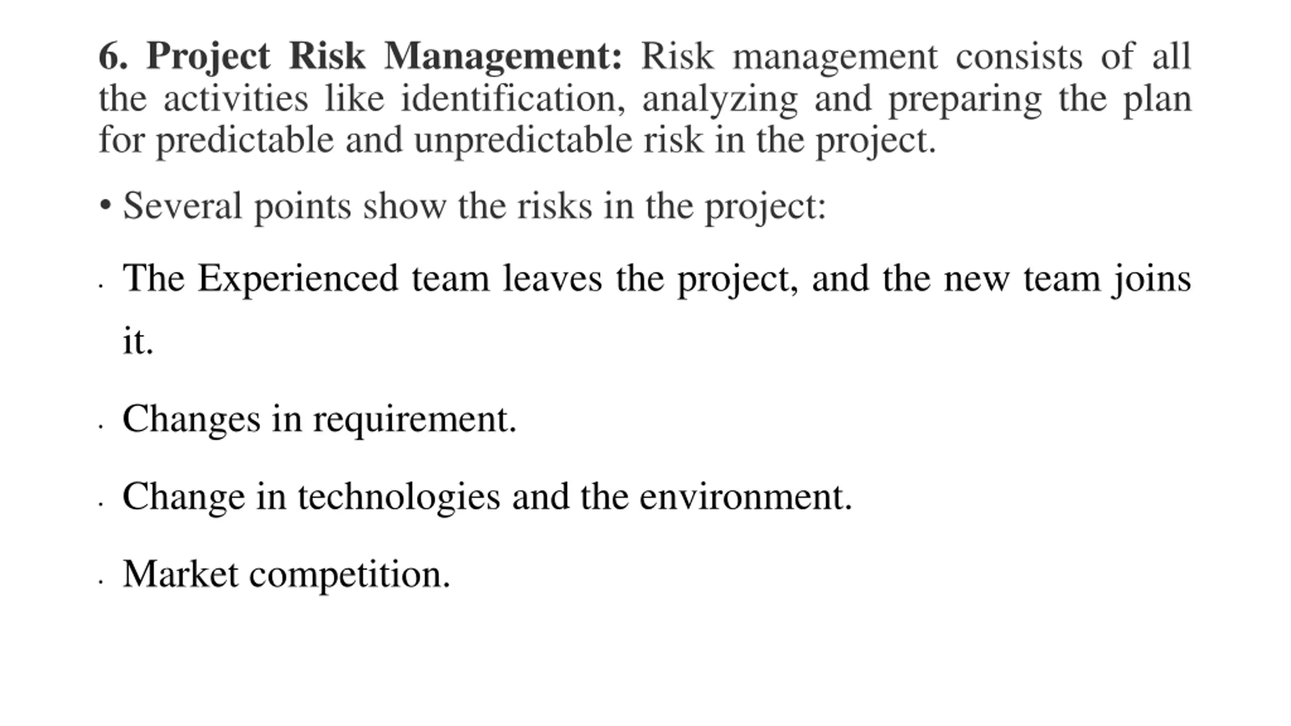 6. Project Risk Management: Risk management consists of all the activities like identification, analyzing and preparing the plan for predictable and unpredictable risk in the project. Several points show the risks in the project: The Experienced team leaves the project, and the new team joins it. Changes in requirement. Change in technologies and the environment. Market competition.