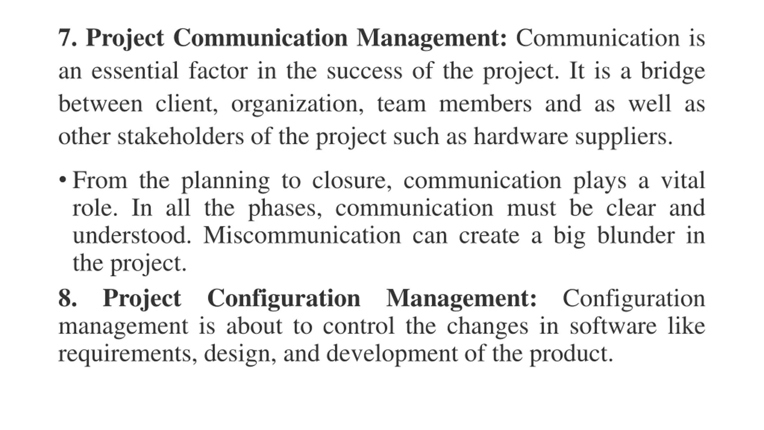 7. Project Communication Management: Communication is an essential factor in the success of the project. It is a bridge between client, organization, team members and as well as other stakeholders of the project such as hardware suppliers. From the planning to closure, communication plays a vital role. In all the phases, communication must be clear and understood. Miscommunication can create a big blunder in the project. 8. Project Configuration management is about to control the changes in software like requirements, design, and development of the product. Management: Configuration