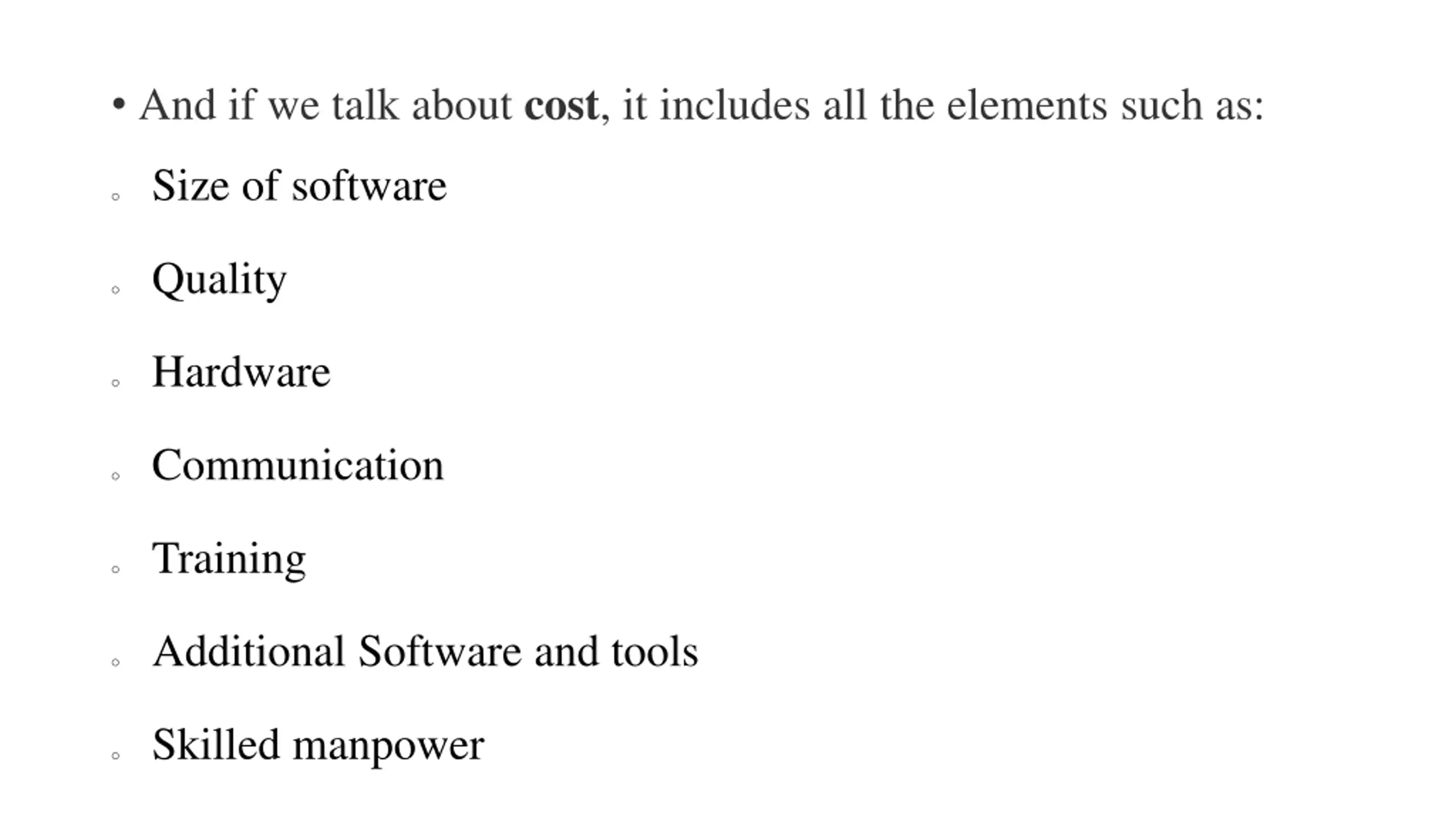 And if we talk about cost, it includes all the elements such as: o Size of software o Quality o Hardware o Communication o Training o Additional Software and tools o Skilled manpower
