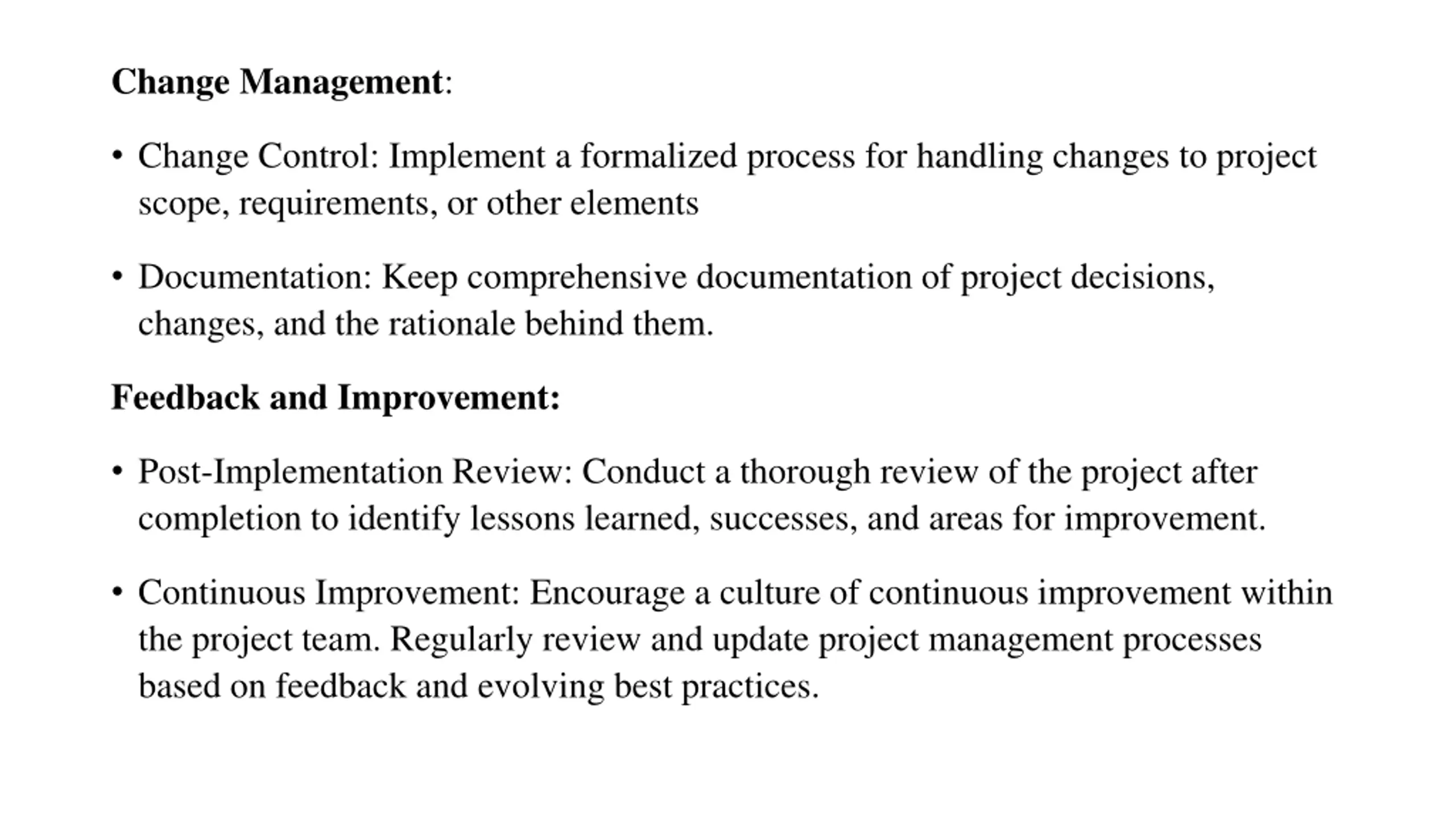 Change Management: Change Control: Implement a formalized process for handling changes to project scope, requirements, or other elements Documentation: Keep comprehensive documentation of project decisions, changes, and the rationale behind them. Feedback and Improvement: Post-Implementation Review: Conduct a thorough review of the project after completion to identify lessons learned, successes, and areas for improvement. Continuous Improvement: Encourage a culture of continuous improvement within the project team. Regularly review and update project management processes based on feedback and evolving best practices.