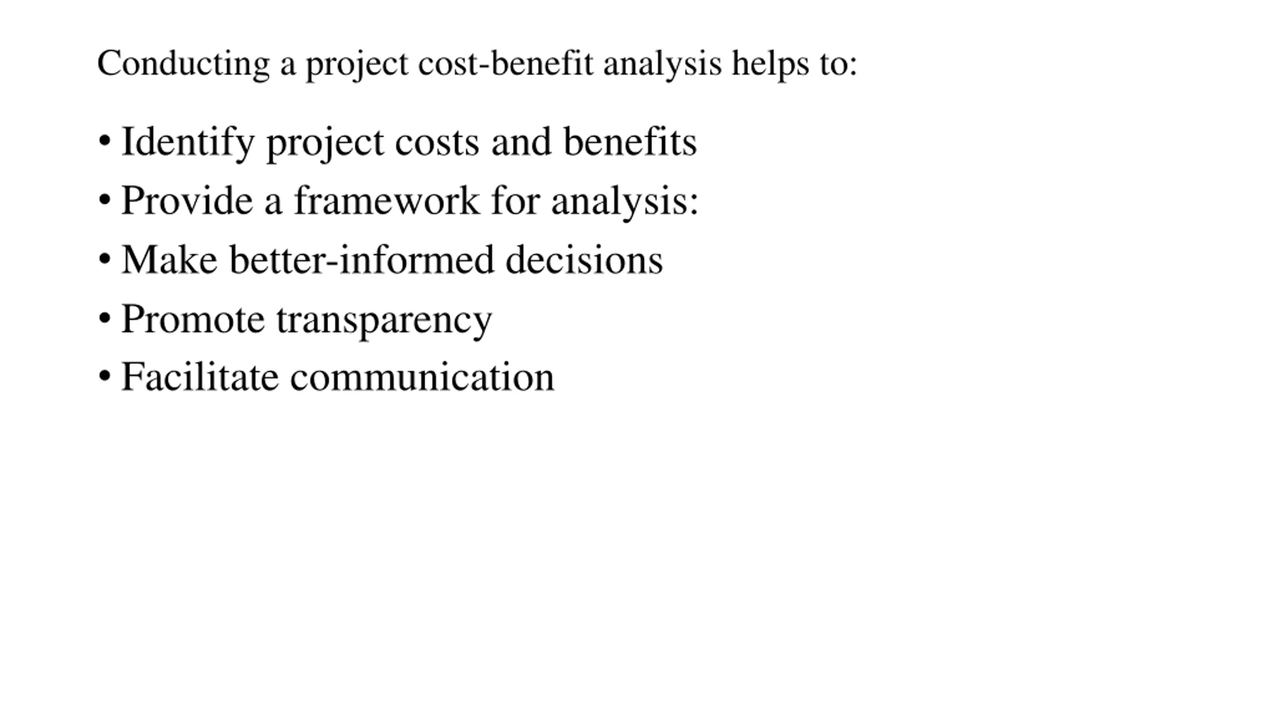Conducting a project cost-benefit analysis helps to: Identify project costs and benefits Provide a framework for analysis: Make better-informed decisions Promote transparency Facilitate communication