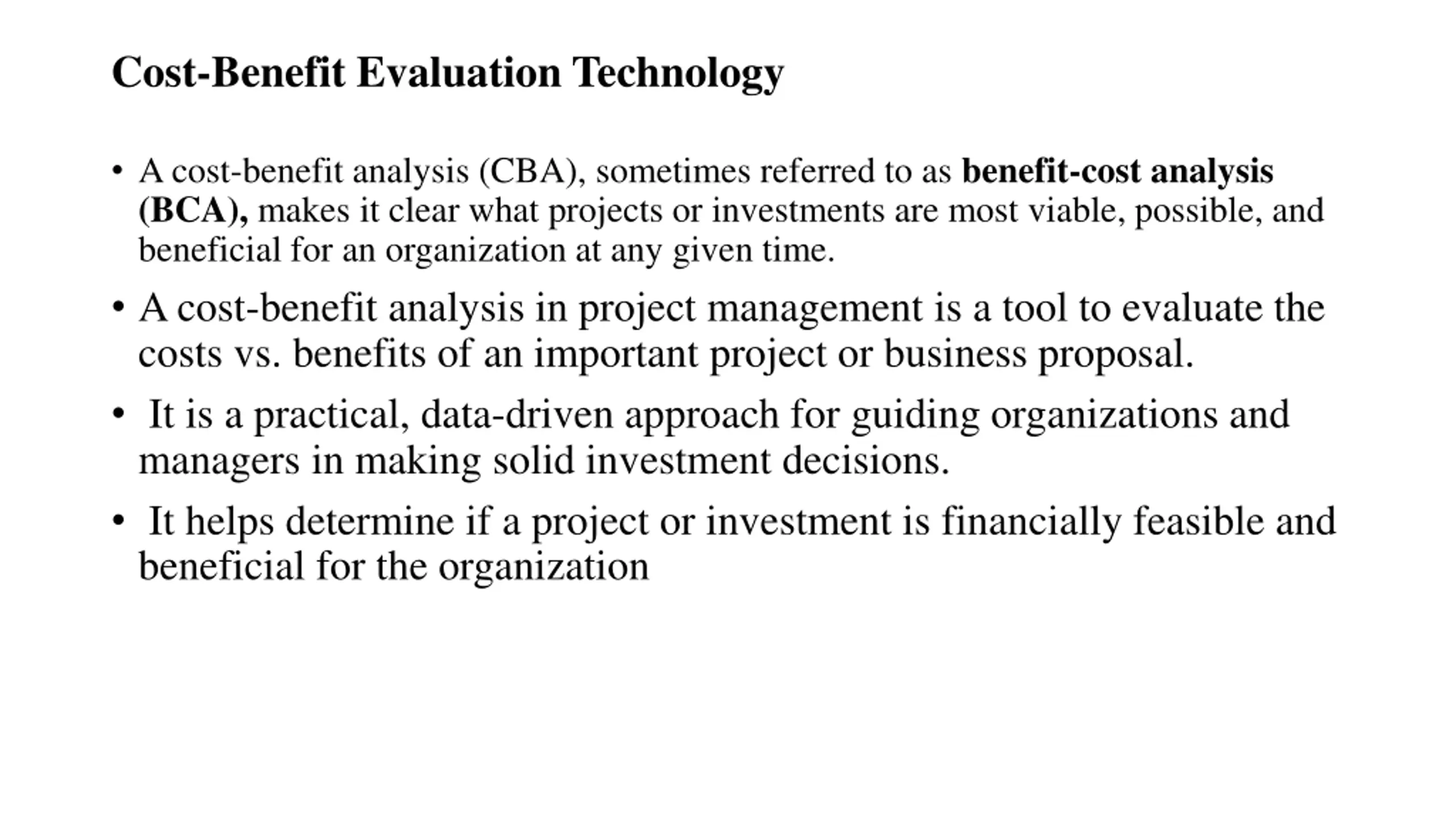 Cost-Benefit Evaluation Technology A cost-benefit analysis (CBA), sometimes referred to as benefit-cost analysis (BCA), makes it clear what projects or investments are most viable, possible, and beneficial for an organization at any given time. A cost-benefit analysis in project management is a tool to evaluate the costs vs. benefits of an important project or business proposal. It is a practical, data-driven approach for guiding organizations and managers in making solid investment decisions. It helps determine if a project or investment is financially feasible and beneficial for the organization
