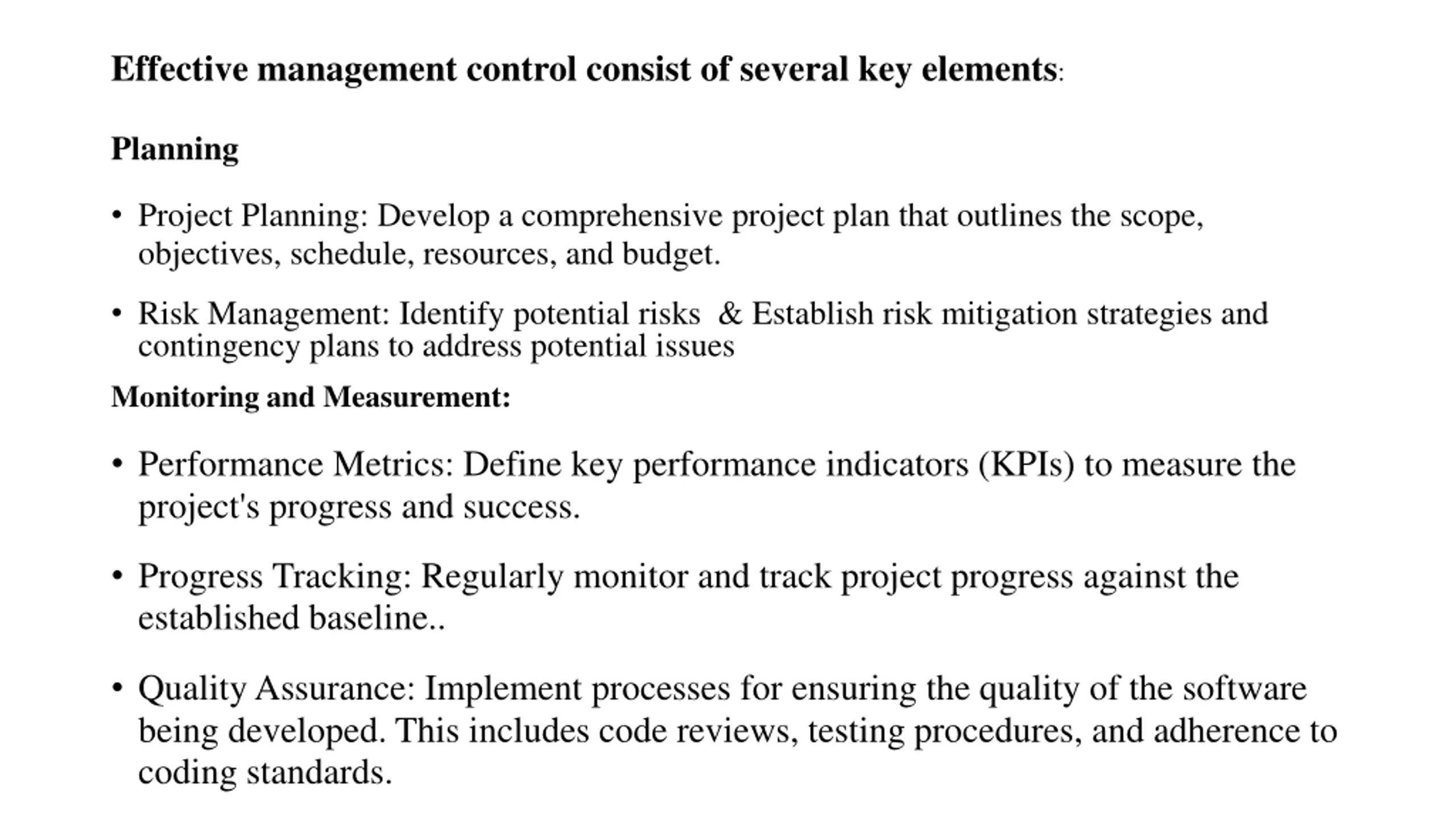 Effective management control consist of several key elements: Planning Project Planning: Develop a comprehensive project plan that outlines the scope, objectives, schedule, resources, and budget. Risk Management: Identify potential risks & Establish risk mitigation strategies and contingency plans to address potential issues Monitoring and Measurement: Performance Metrics: Define key performance indicators (KPIs) to measure the project's progress and success. Progress Tracking: Regularly monitor and track project progress against the established baseline.. Quality Assurance: Implement processes for ensuring the quality of the software being developed. This includes code reviews, testing procedures, and adherence to coding standards.