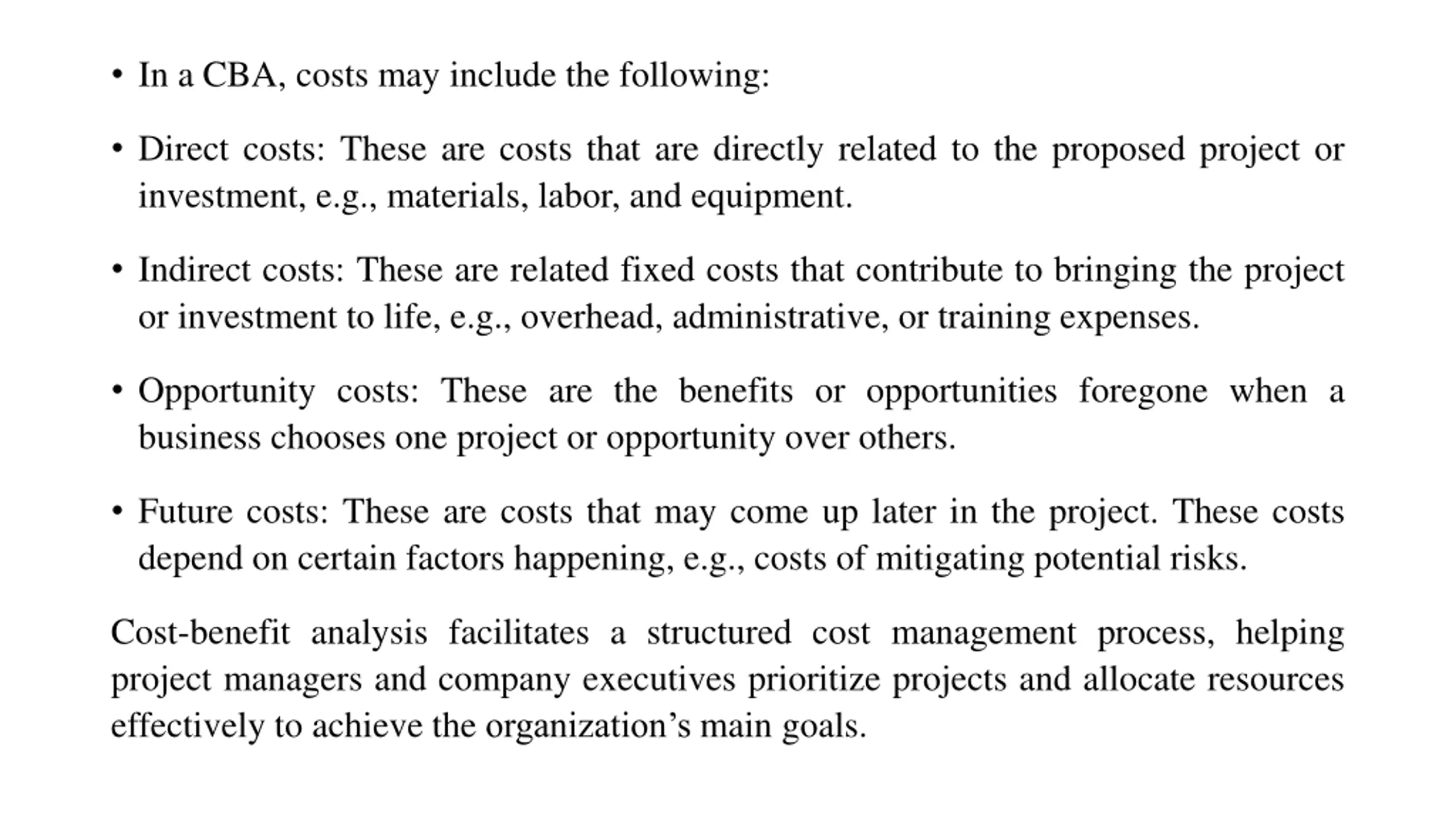 In a CBA, costs may include the following: Direct costs: These are costs that are directly related to the proposed project or investment, e.g., materials, labor, and equipment. Indirect costs: These are related fixed costs that contribute to bringing the project or investment to life, e.g., overhead, administrative, or training expenses. Opportunity costs: These are the benefits or opportunities foregone when a business chooses one project or opportunity over others. Future costs: These are costs that may come up later in the project. These costs depend on certain factors happening, e.g., costs of mitigating potential risks. Cost-benefit analysis facilitates a structured cost management process, helping project managers and company executives prioritize projects and allocate resources effectively to achieve the organization s main goals.