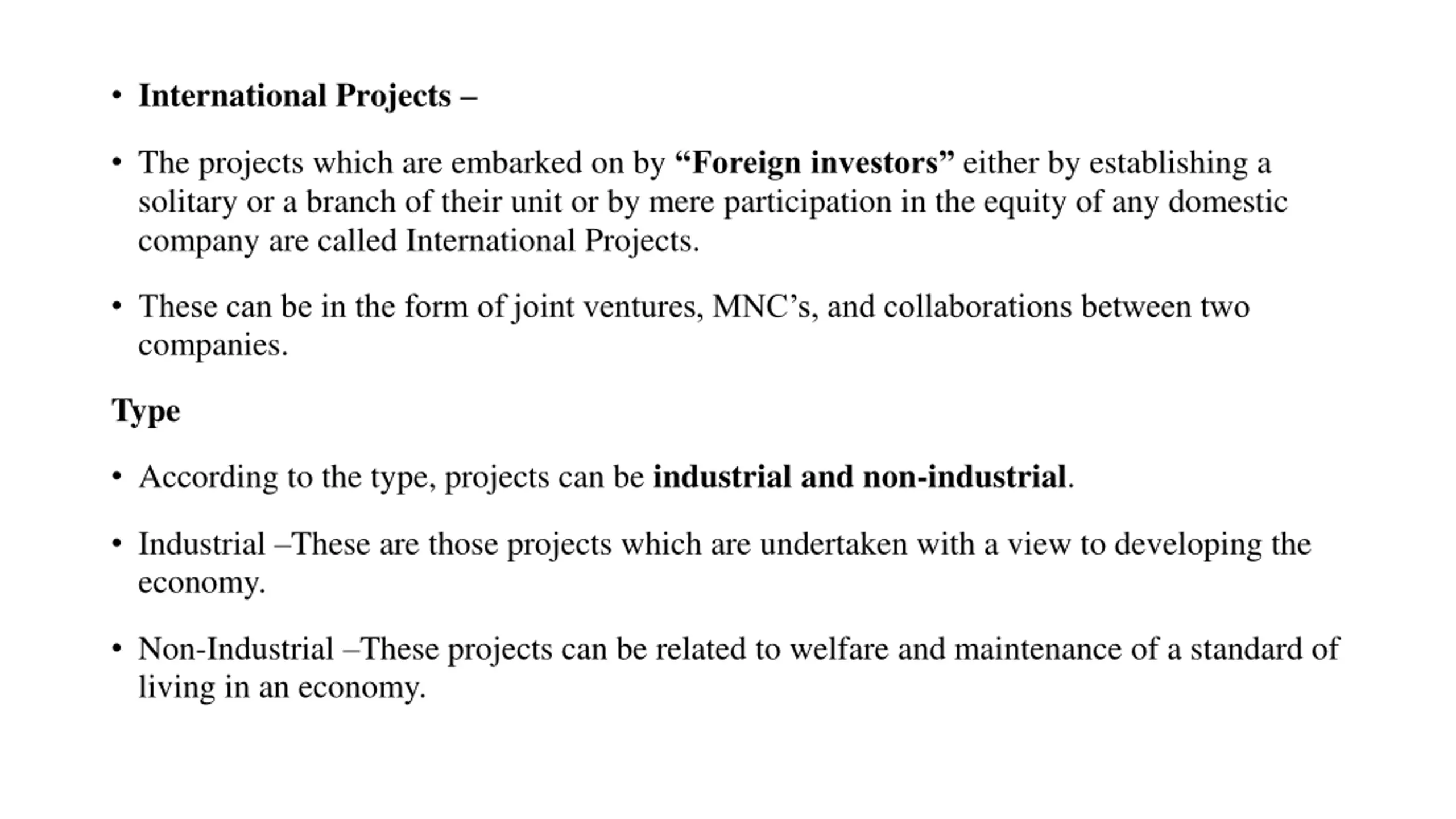 International Projects The projects which are embarked on by Foreign investors either by establishing a solitary or a branch of their unit or by mere participation in the equity of any domestic company are called International Projects. These can be in the form of joint ventures, MNC s, and collaborations between two companies. Type According to the type, projects can be industrial and non-industrial. Industrial These are those projects which are undertaken with a view to developing the economy. Non-Industrial These projects can be related to welfare and maintenance of a standard of living in an economy.