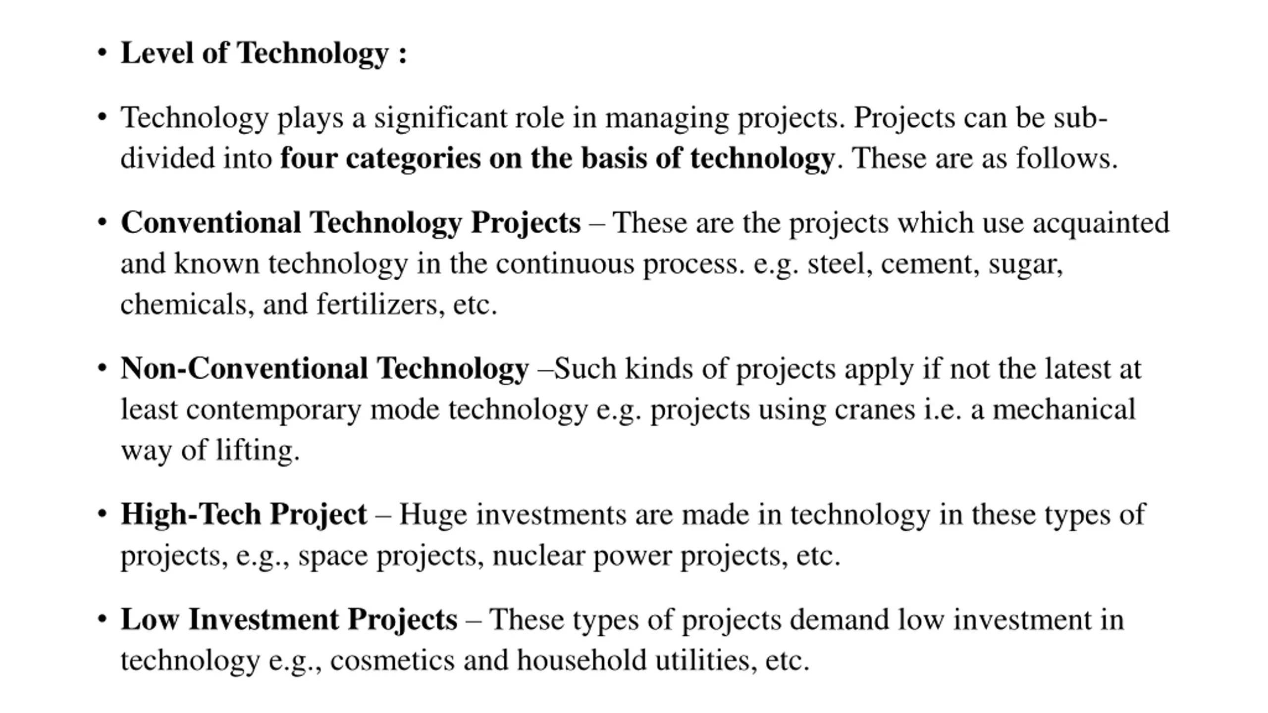 Level of Technology : Technology plays a significant role in managing projects. Projects can be sub- divided into four categories on the basis of technology. These are as follows. Conventional Technology Projects These are the projects which use acquainted and known technology in the continuous process. e.g. steel, cement, sugar, chemicals, and fertilizers, etc. Non-Conventional Technology Such kinds of projects apply if not the latest at least contemporary mode technology e.g. projects using cranes i.e. a mechanical way of lifting. High-Tech Project Huge investments are made in technology in these types of projects, e.g., space projects, nuclear power projects, etc. Low Investment Projects These types of projects demand low investment in technology e.g., cosmetics and household utilities, etc.