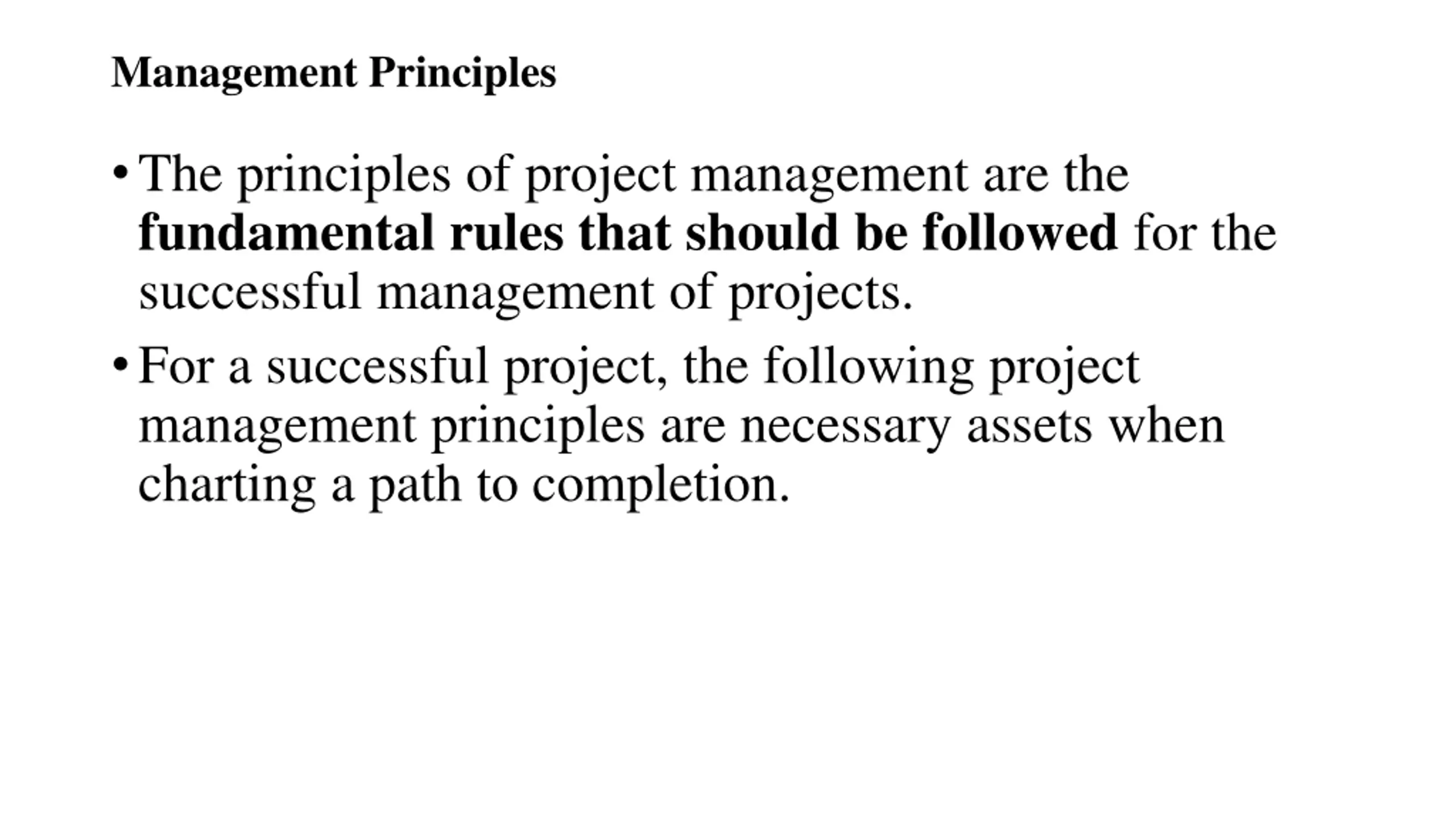 Management Principles The principles of project management are the fundamental rules that should be followed for the successful management of projects. For a successful project, the following project management principles are necessary assets when charting a path to completion.