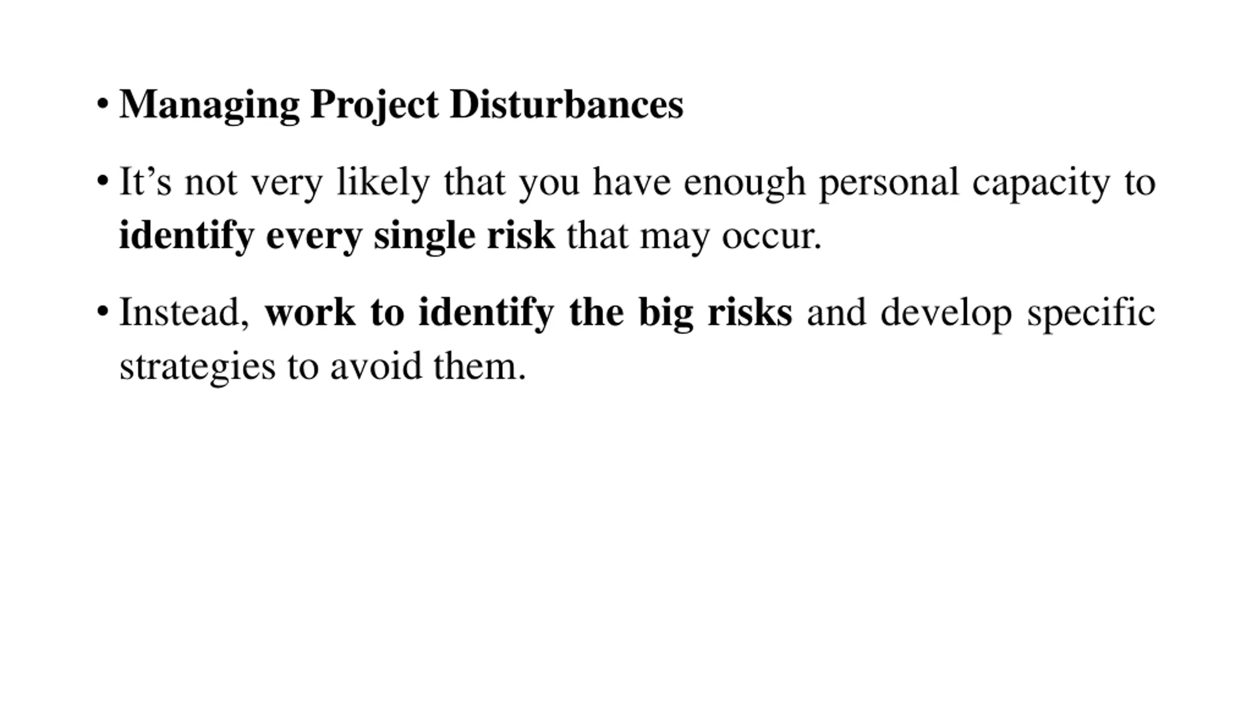 Managing Project Disturbances It s not very likely that you have enough personal capacity to identify every single risk that may occur. Instead, work to identify the big risks and develop specific strategies to avoid them.