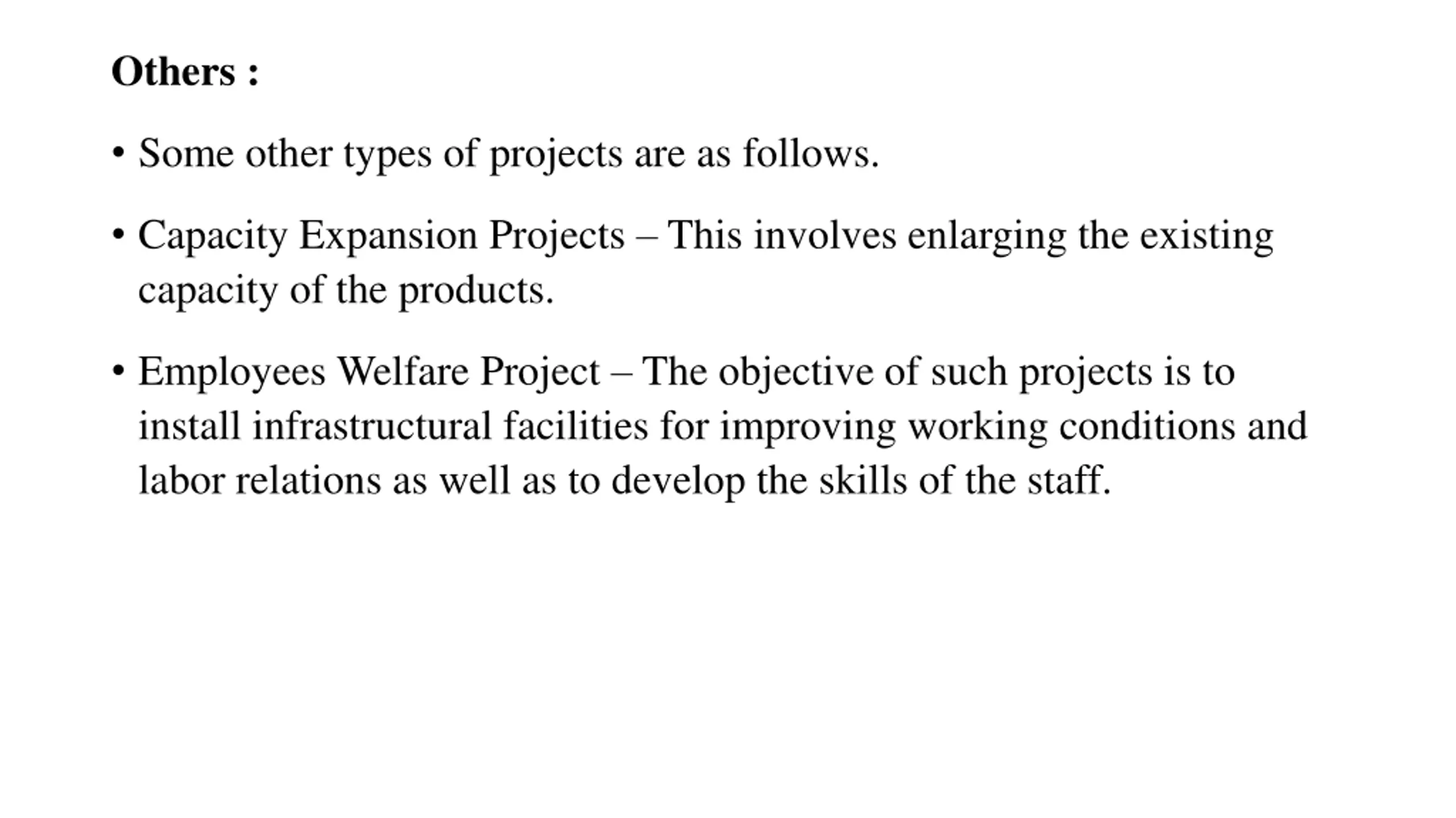 Others : Some other types of projects are as follows. Capacity Expansion Projects This involves enlarging the existing capacity of the products. Employees Welfare Project The objective of such projects is to install infrastructural facilities for improving working conditions and labor relations as well as to develop the skills of the staff.