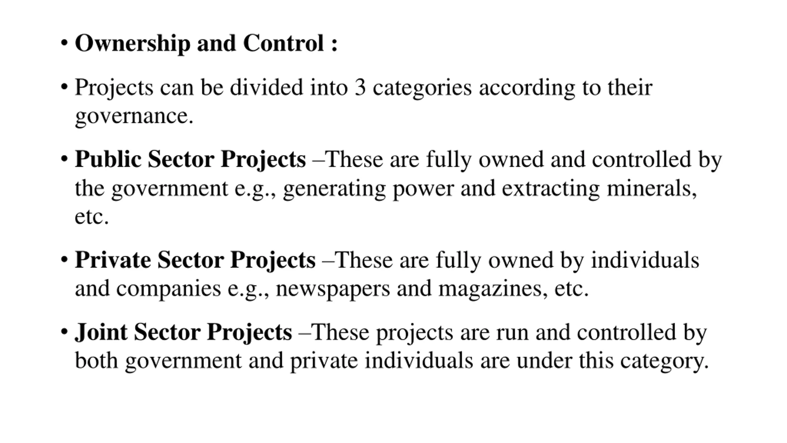 Ownership and Control : Projects can be divided into 3 categories according to their governance. Public Sector Projects These are fully owned and controlled by the government e.g., generating power and extracting minerals, etc. Private Sector Projects These are fully owned by individuals and companies e.g., newspapers and magazines, etc. Joint Sector Projects These projects are run and controlled by both government and private individuals are under this category.