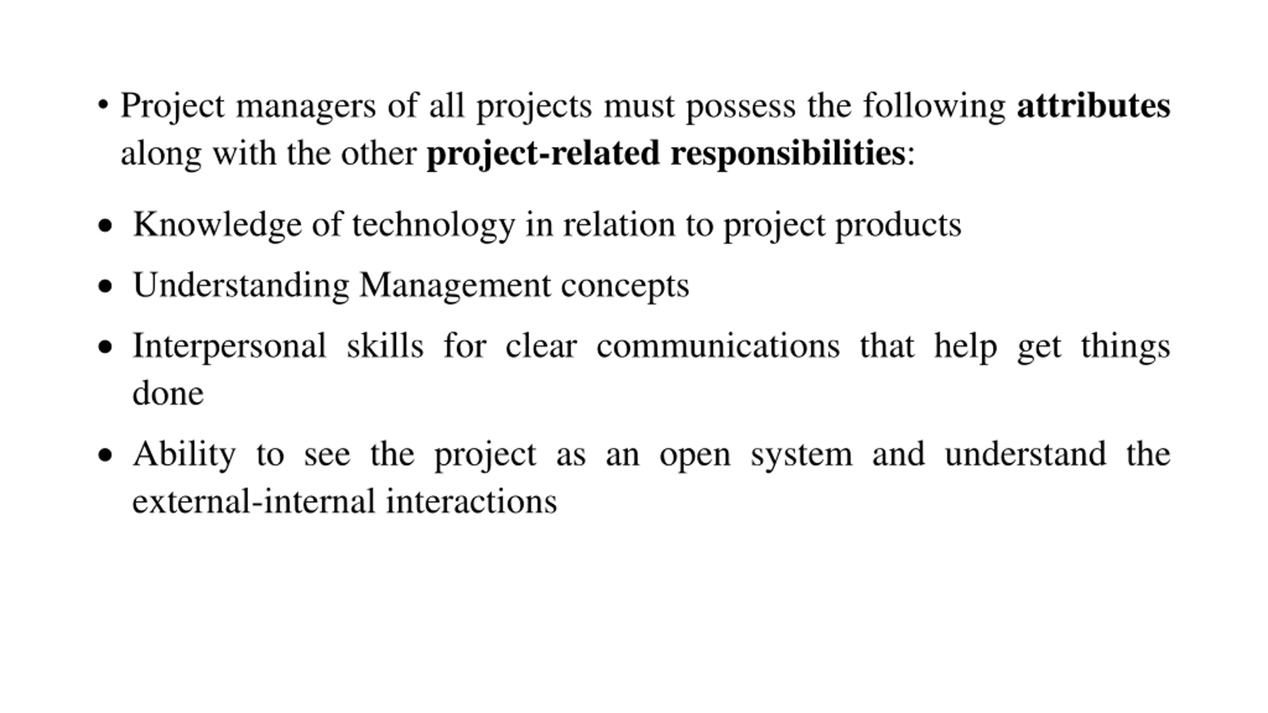 Project managers of all projects must possess the following attributes along with the other project-related responsibilities: Knowledge of technology in relation to project products Understanding Management concepts Interpersonal skills for clear communications that help get things done Ability to see the project as an open system and understand the external-internal interactions