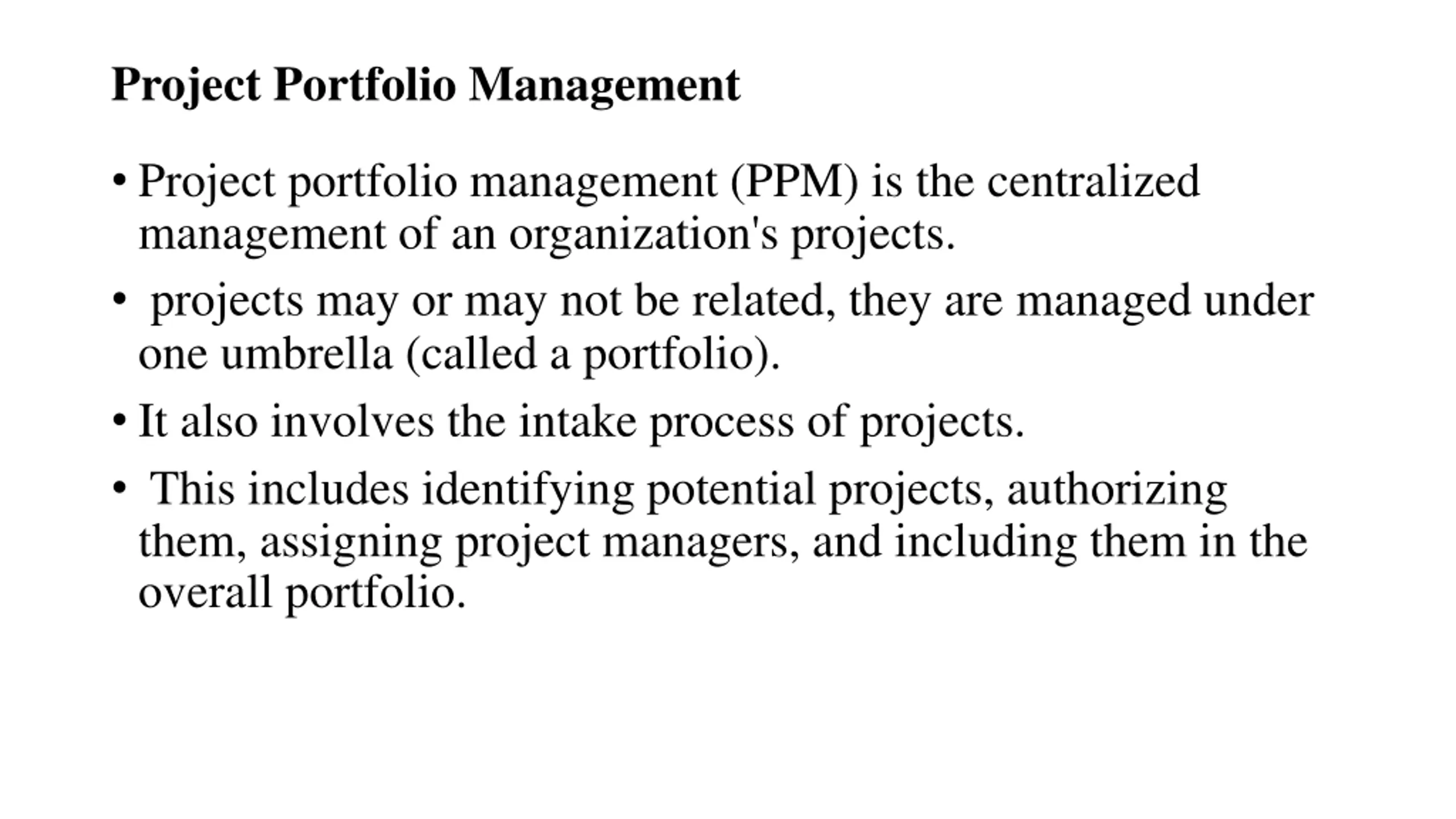 Project Portfolio Management Project portfolio management (PPM) is the centralized management of an organization's projects. projects may or may not be related, they are managed under one umbrella (called a portfolio). It also involves the intake process of projects. This includes identifying potential projects, authorizing them, assigning project managers, and including them in the overall portfolio.
