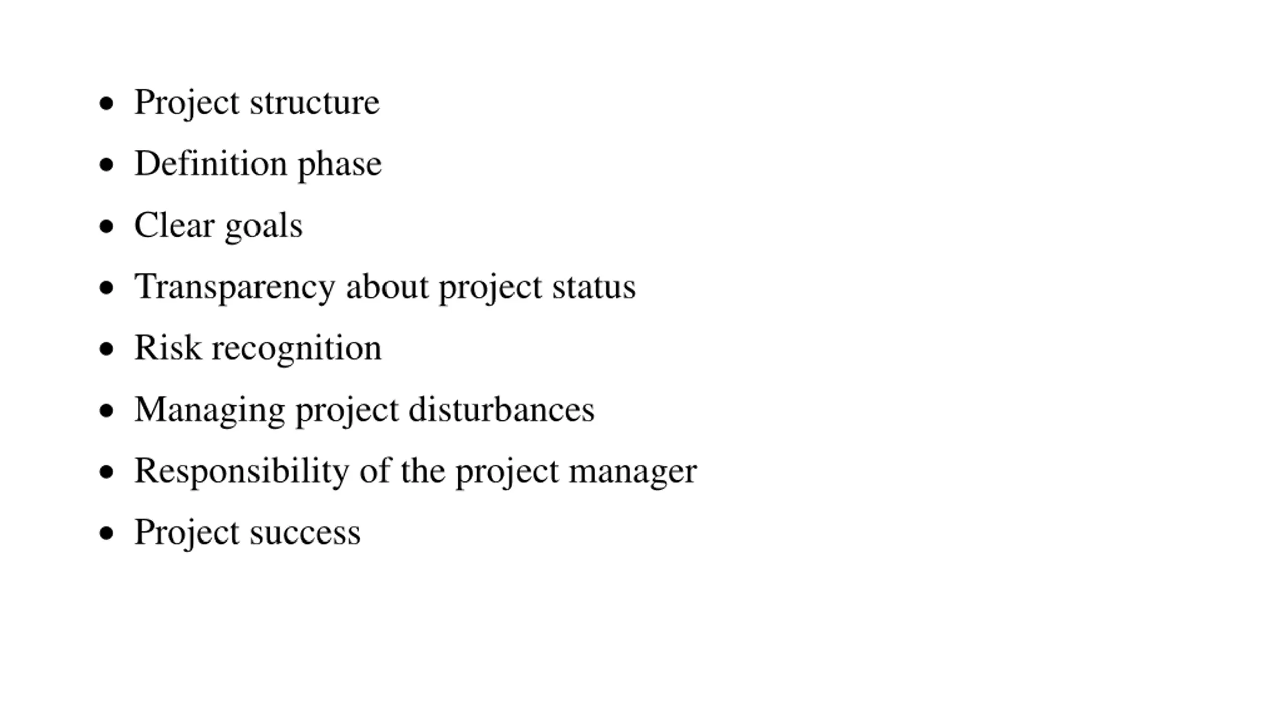 Project structure Definition phase Clear goals Transparency about project status Risk recognition Managing project disturbances Responsibility of the project manager Project success