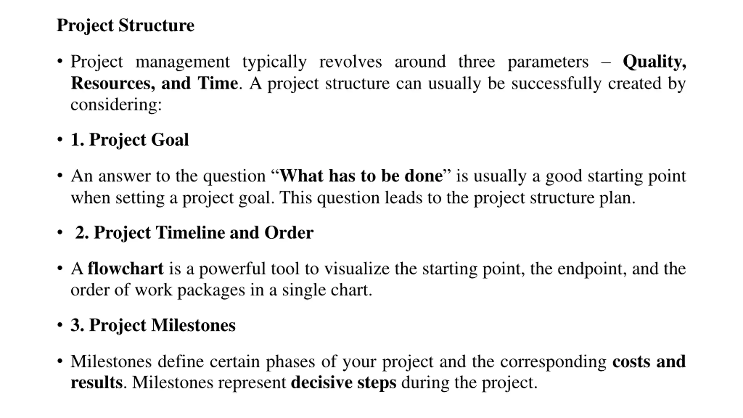 Project Structure Project management typically revolves around three parameters Quality, Resources, and Time. A project structure can usually be successfully created by considering: 1. Project Goal An answer to the question What has to be done is usually a good starting point when setting a project goal. This question leads to the project structure plan. 2. Project Timeline and Order A flowchart is a powerful tool to visualize the starting point, the endpoint, and the order of work packages in a single chart. 3. Project Milestones Milestones define certain phases of your project and the corresponding costs and results. Milestones represent decisive steps during the project.
